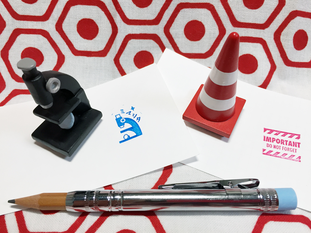 前から欲しかった顕微鏡型のはんこと三角コーン型のはんこ、あと未入手だったクリップつきの鉛筆補助軸を購入。