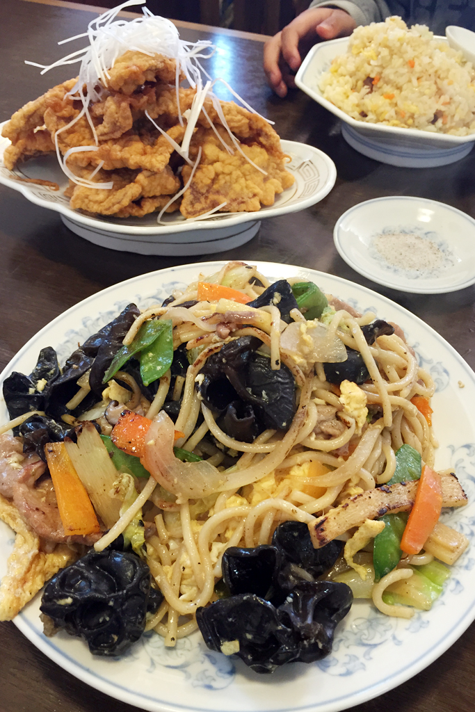 きくらげがでかくて量が多いことで有名な玉子キクラゲ焼きそばと、山盛りの肉カラアゲで満腹になりました。
