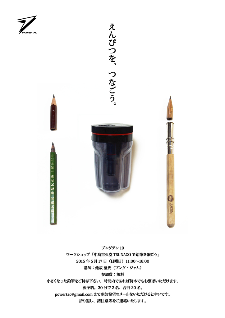 ・鉛筆は各自ご持参下さい。こちらでは数を用意することができません。「もったいないので、短くなった鉛筆を繋いで使おう」というワークショップですので、今回はこの作業のために切った鉛筆を用意することはいたしません。