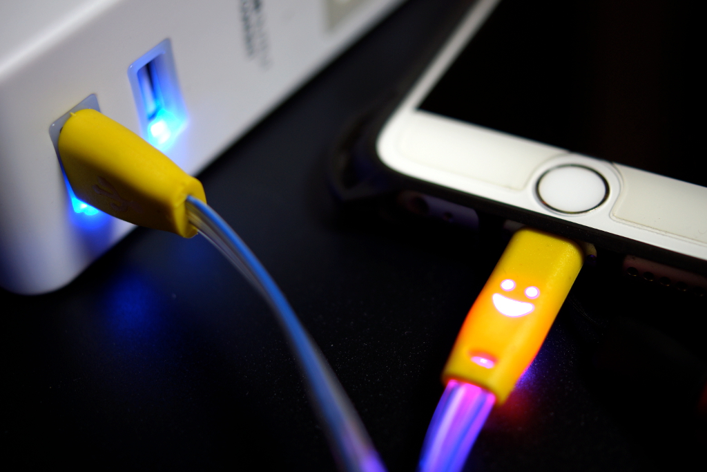 光るライトニングケーブルはコネクタだけじゃなくてケーブルじたいもびかびか光ります。充電が終わってもびかびか光ります。うちのiPhone6は充電できましたけど、iPadAirは充電できませんでした。でもまあ家で充電専用にする分には面白いかな、と。