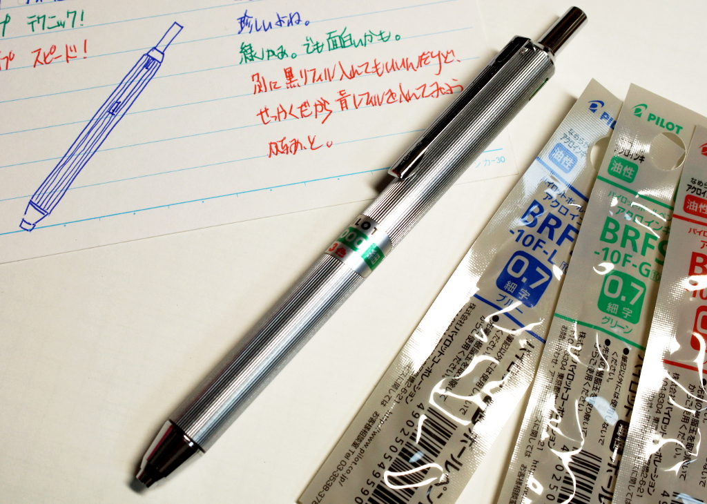 3色ボールペンに緑 1971年製、パイロットの3色ボールペン。日曜日にお伺いした螢窓舎での買い物のひとつです。 黒、赤、緑。珍しいですよね、3色目が青じゃなくて緑、って。さっそく最新の替芯であるアクロ芯BRFS-10Fに換装しました。44年前のボールペンが、最新の書き味です。表示のまま黒、赤、緑と入れてもよかったのですが、ここはあえて黒の部分に青を。青、赤、緑。これまたイレギュラーな、レトロ感溢れる斎藤式3色ボールペンの誕生です。鞄につけて持ち歩きましょうかね。 [3回] コメント コメントを書く コメントを書く コメント送信