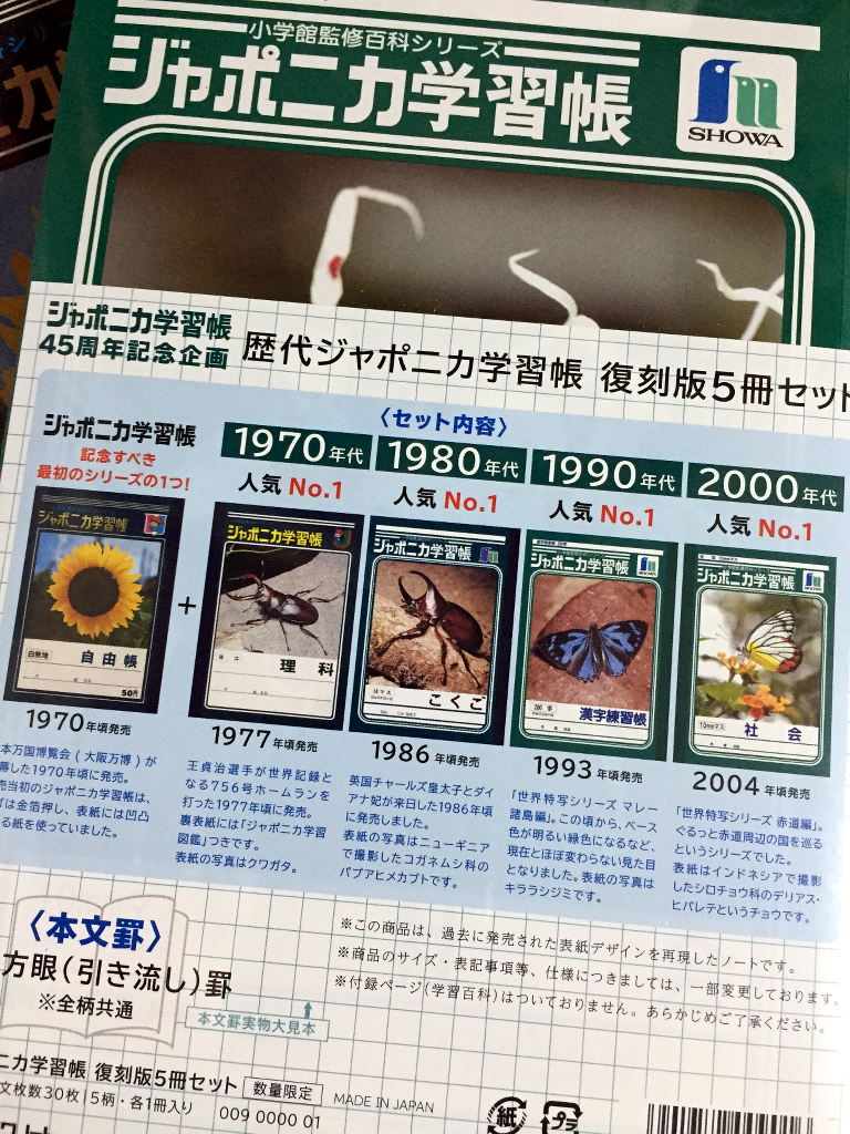 Web投票の結果生まれた、ジャポニカ学習帳45周年企画「歴代ジャポニカ学習帳 復刻版5冊セット」が届きました。