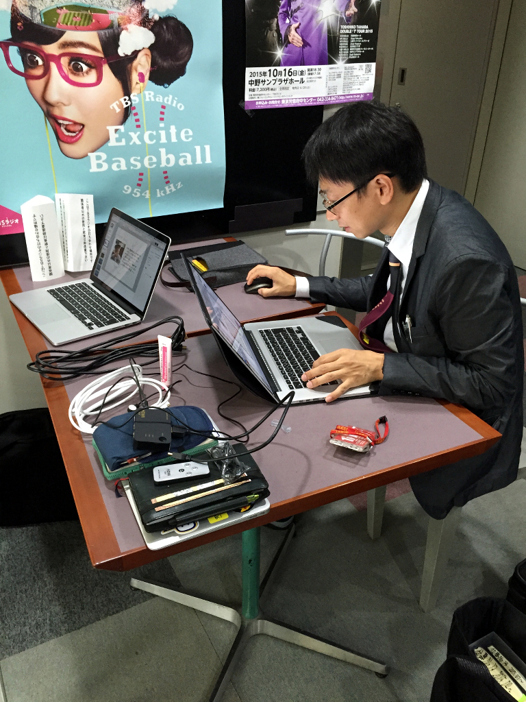 受付でワンデイパスを受け取り、ラジオスタジオのある9階まで上がっていったら、先に入っていた文具王が特設スタジオの廊下の隅でデータを作っていました。
