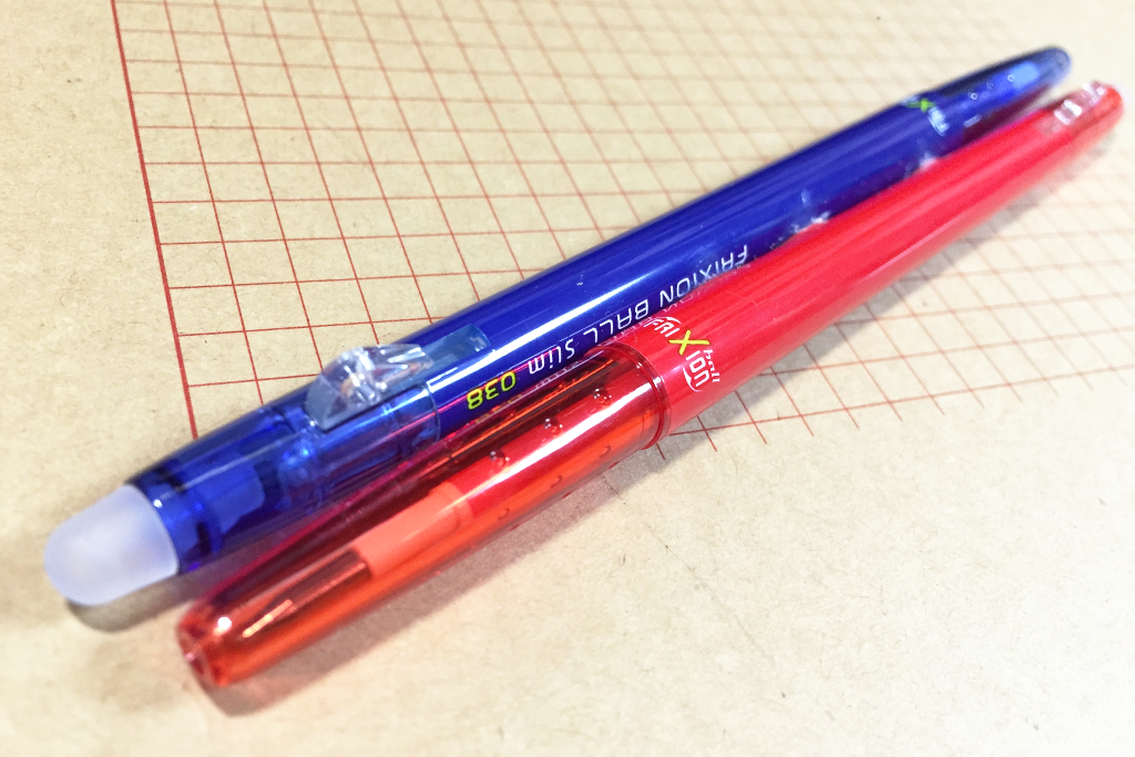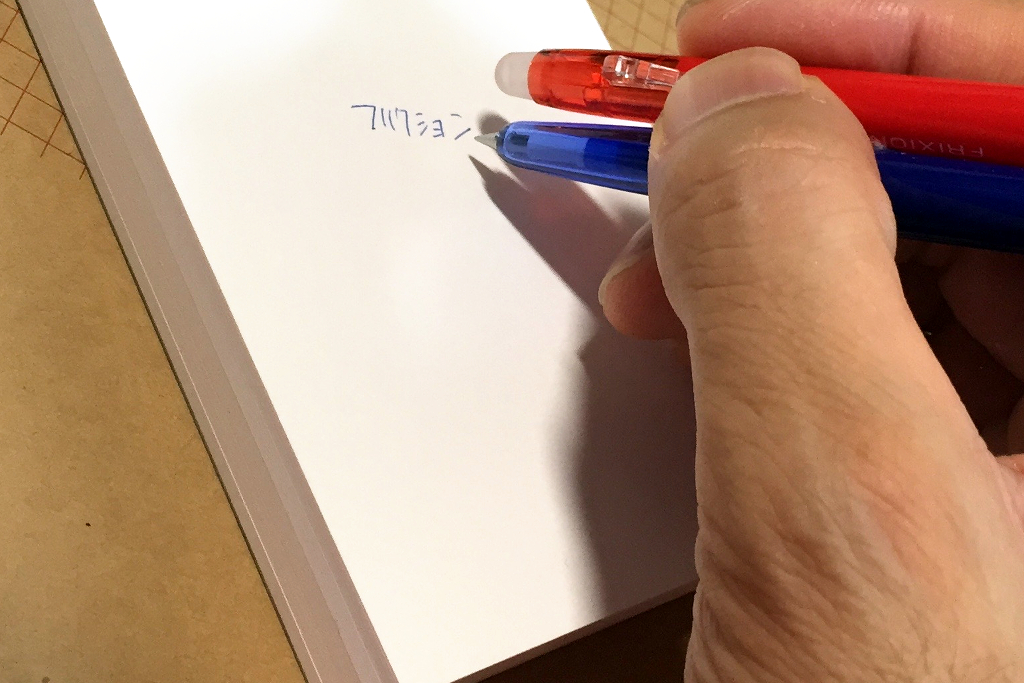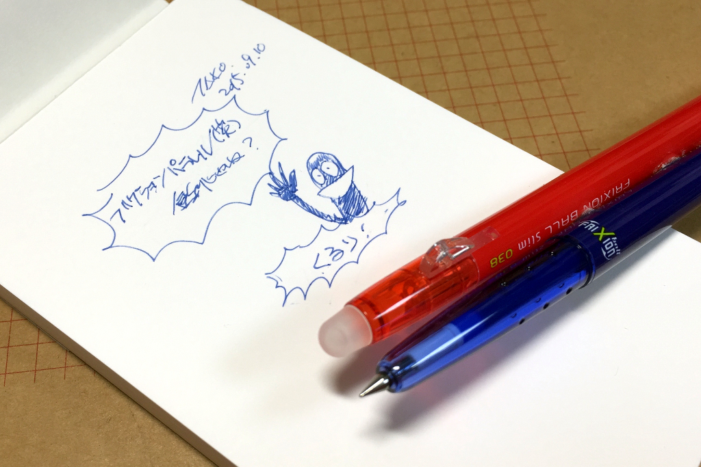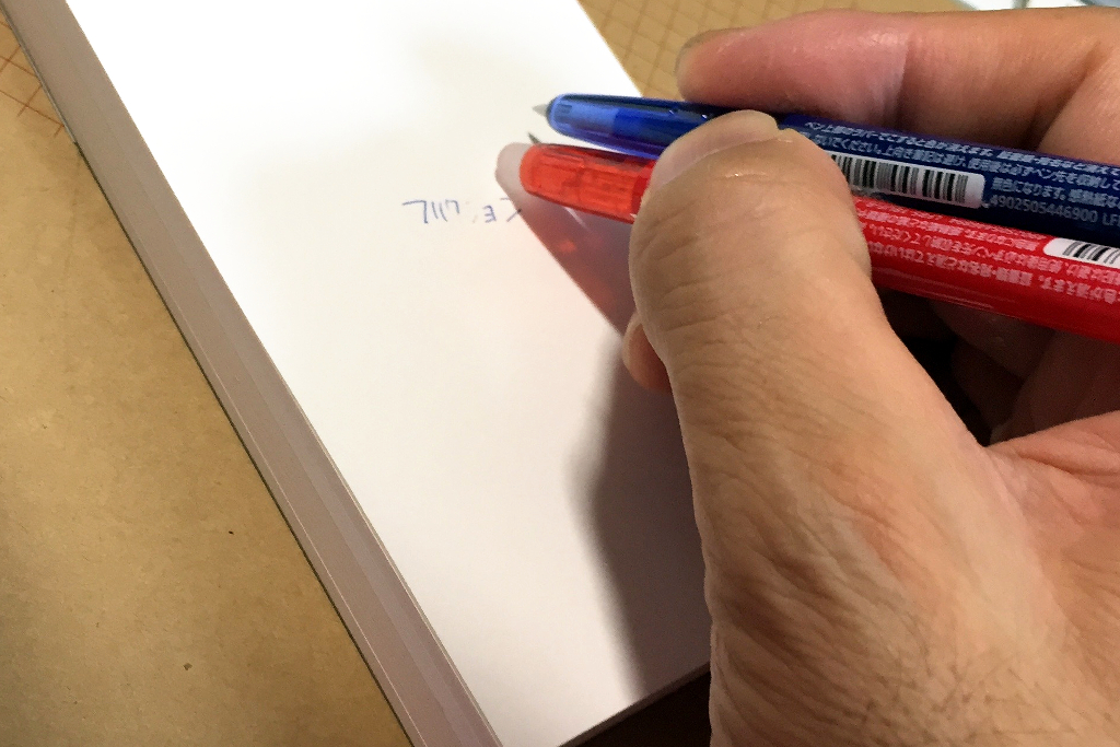 一枚目の写真のニコペンみたいに、フリクションボールスリム0.38が2本平行で並んでいて、こう縦に積んでるみたいな形になればな、と。