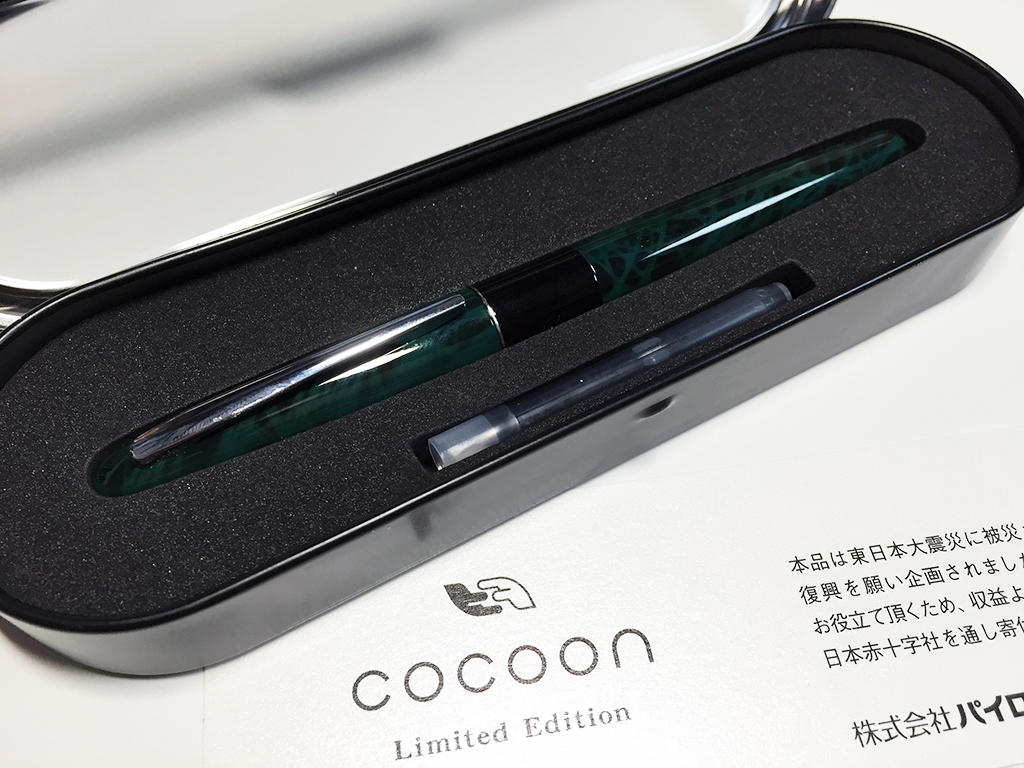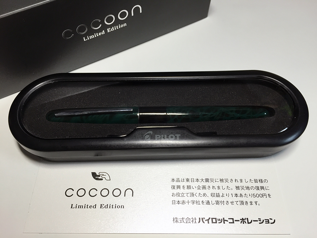コクーン2015リミテッドエディション。東北地方への義援金を本体料金に含んだ、毎年恒例の限定シリーズです。今年はコクーン万年筆が対象に選ばれています。