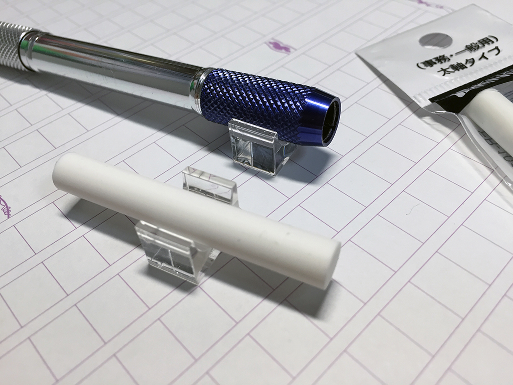 この補助軸は両端にチャックがついているので、後端に消しゴムを挟むことができます。