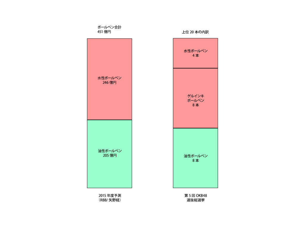 体感的にはRBBの作った「やや油性ボールペンが多い状況」のほうがしっくりくる部分もあるのですが、消費者の視点で観るとOKB48の結果も妥当かなあ、と思えてきます。