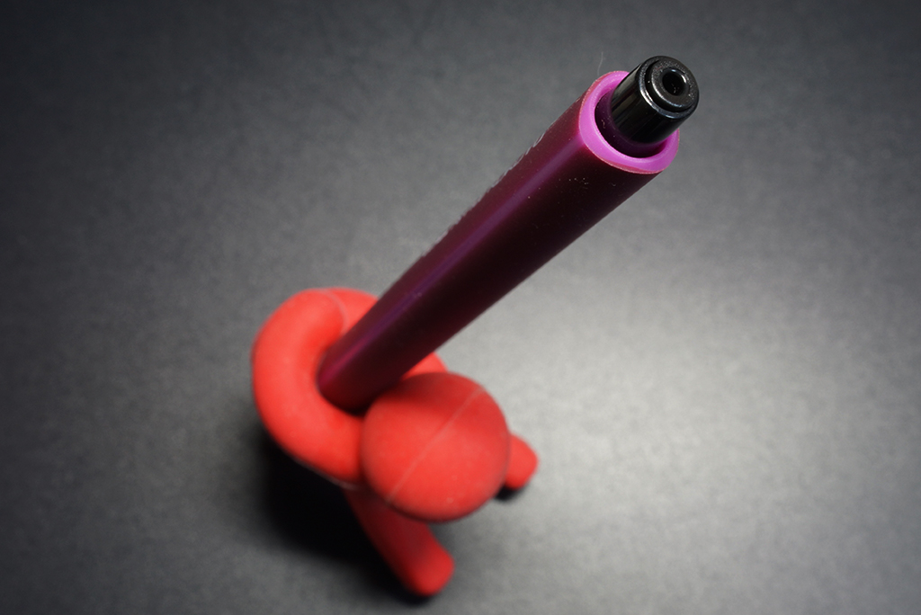 発売から5年──実に5年ぶりに触れた鉛筆シャープは、芯を補充するのにこのノックノブの穴を使うことに変わりはないのに、振ろうが逆さにしようが芯が出ない画期的な改良──逆流防止弁が装備され、まっとうな存在となっておりました。