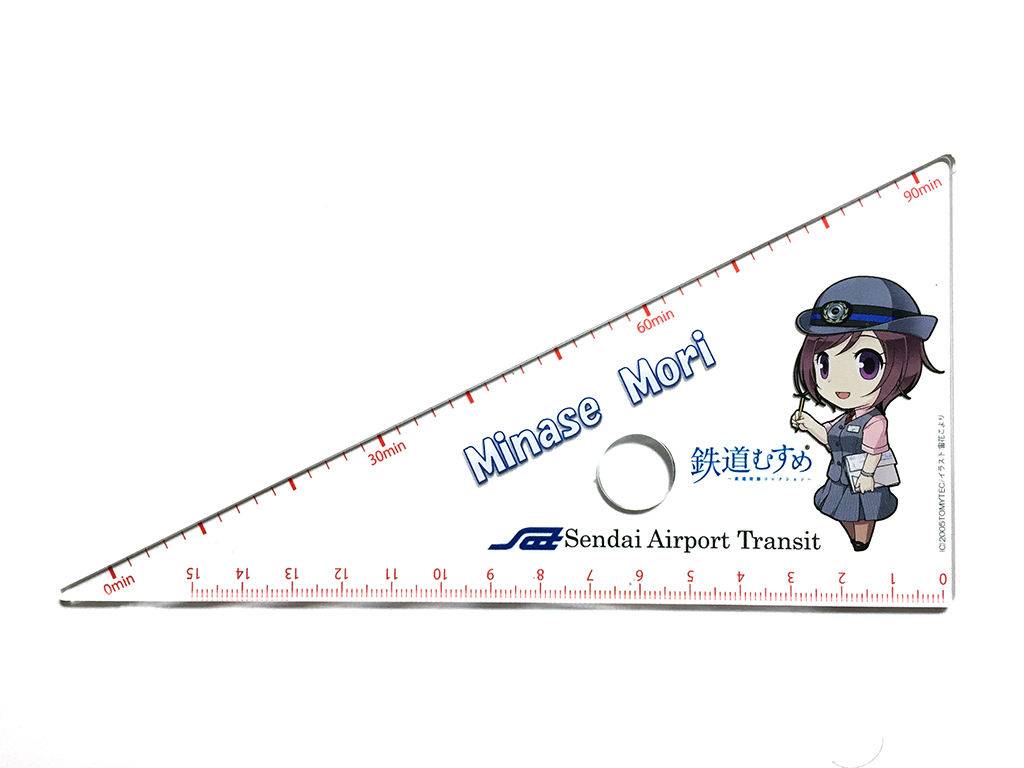 彼女のグッズが三角定規なのは、彼女がダイヤグラムを組む業務、運輸司令員だからなのですね。斜辺の目盛りが「min」になっているのも頷けます。これはもしかしたら、いっしょに売っていたダイヤグラム楽習帳と連動していたのでは……?