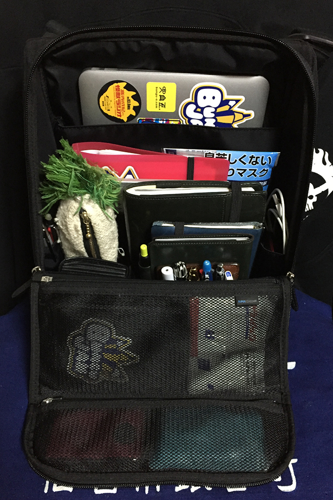 フラップのメッシュポケットは、大きい方にティッシュとメモッタラ。小さい方に名刺入れデーターと鍵をつけた小物入れ。