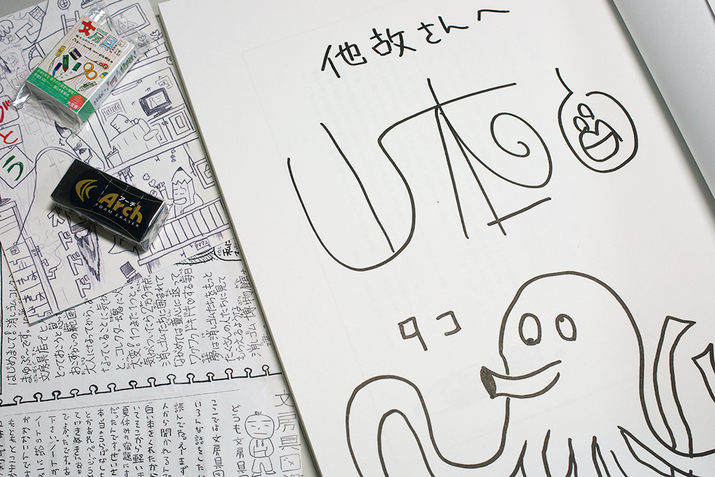 中には健太郎くんのポストカードサイズイラスト「ありがとうカード」や『文房具図鑑』秘話の載った手書きの「TANTAN OMEDETO NEWS」、そして消しゴムが2個。
