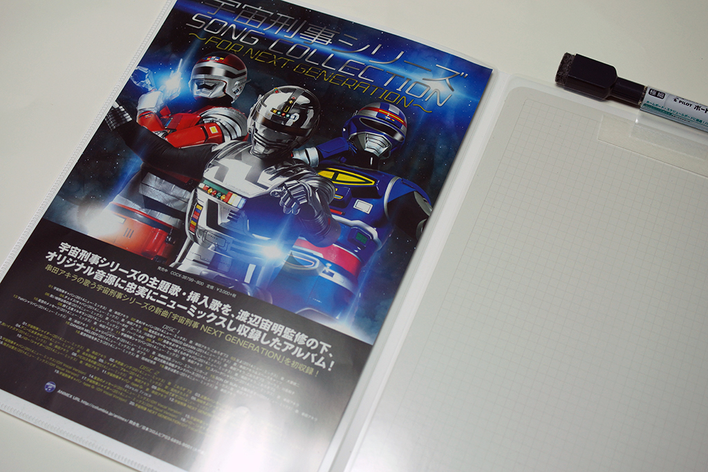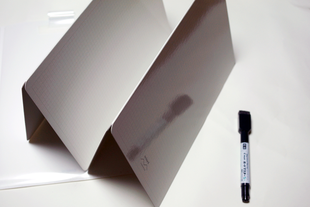 4つに折る方向は決まっていますので(必ず5mm方眼のボードが表面に出ます)しまうときに書き込んだ図表を保護したい、あるいはホルダーに入れるとはいえ書いた面を不用意に晒したくない場合は、無地ボードに記入しましょう。