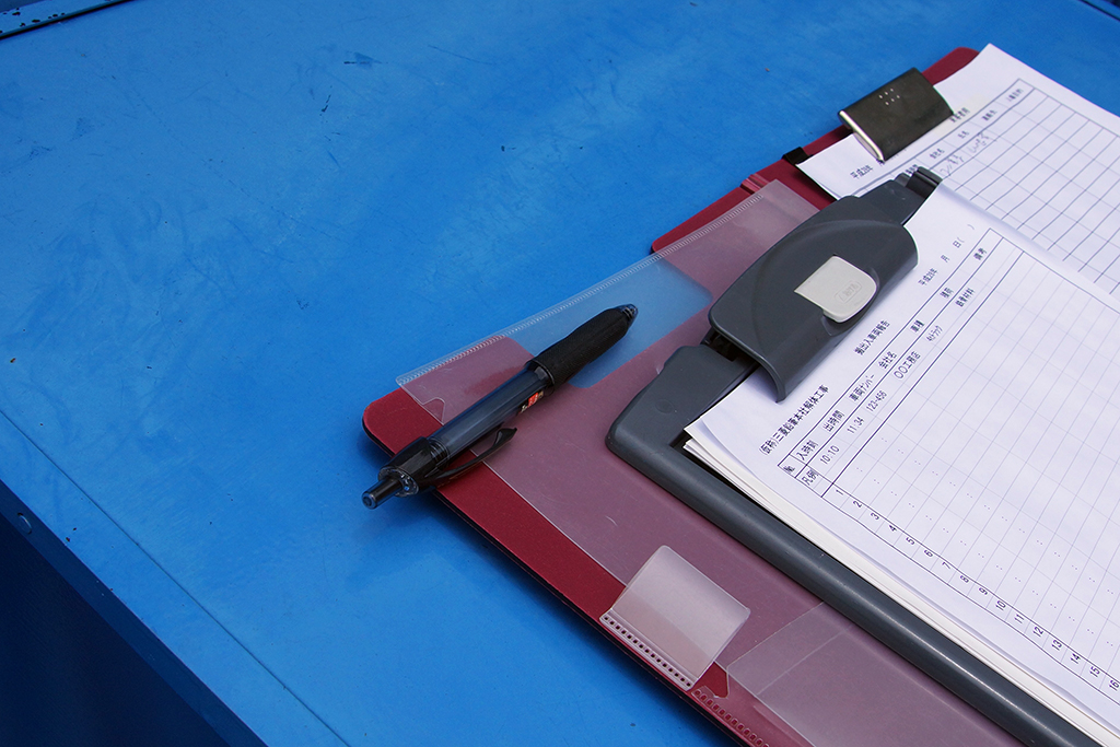 その工事現場にあった書類と筆記具。