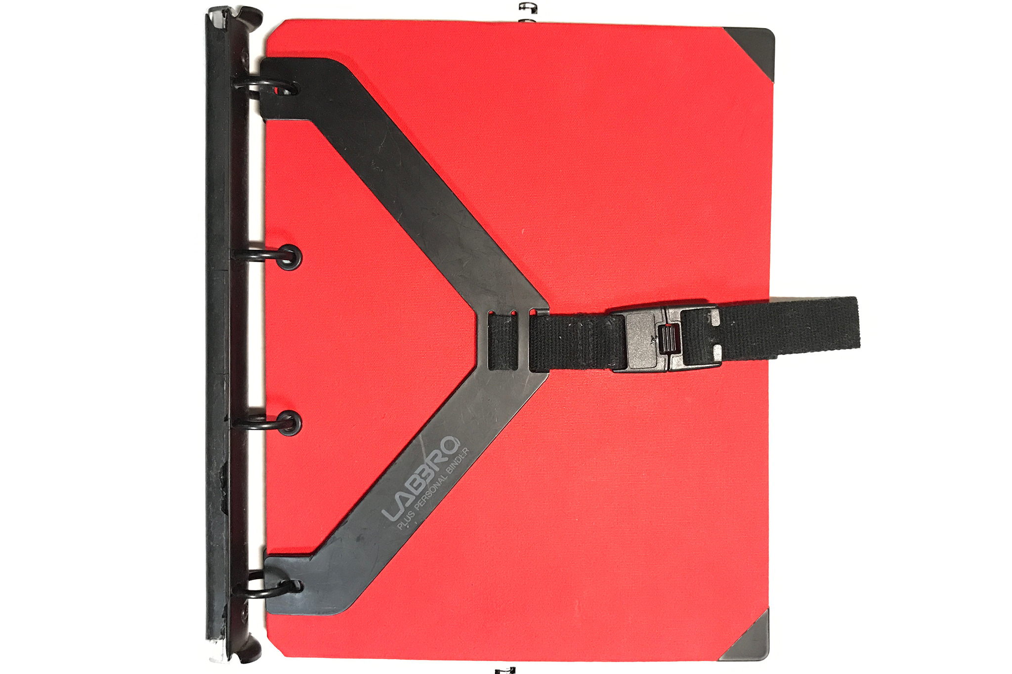A4判4穴、ボディはベルトで固定され、金具は剥き出しという野心的デザインのバインダーです。