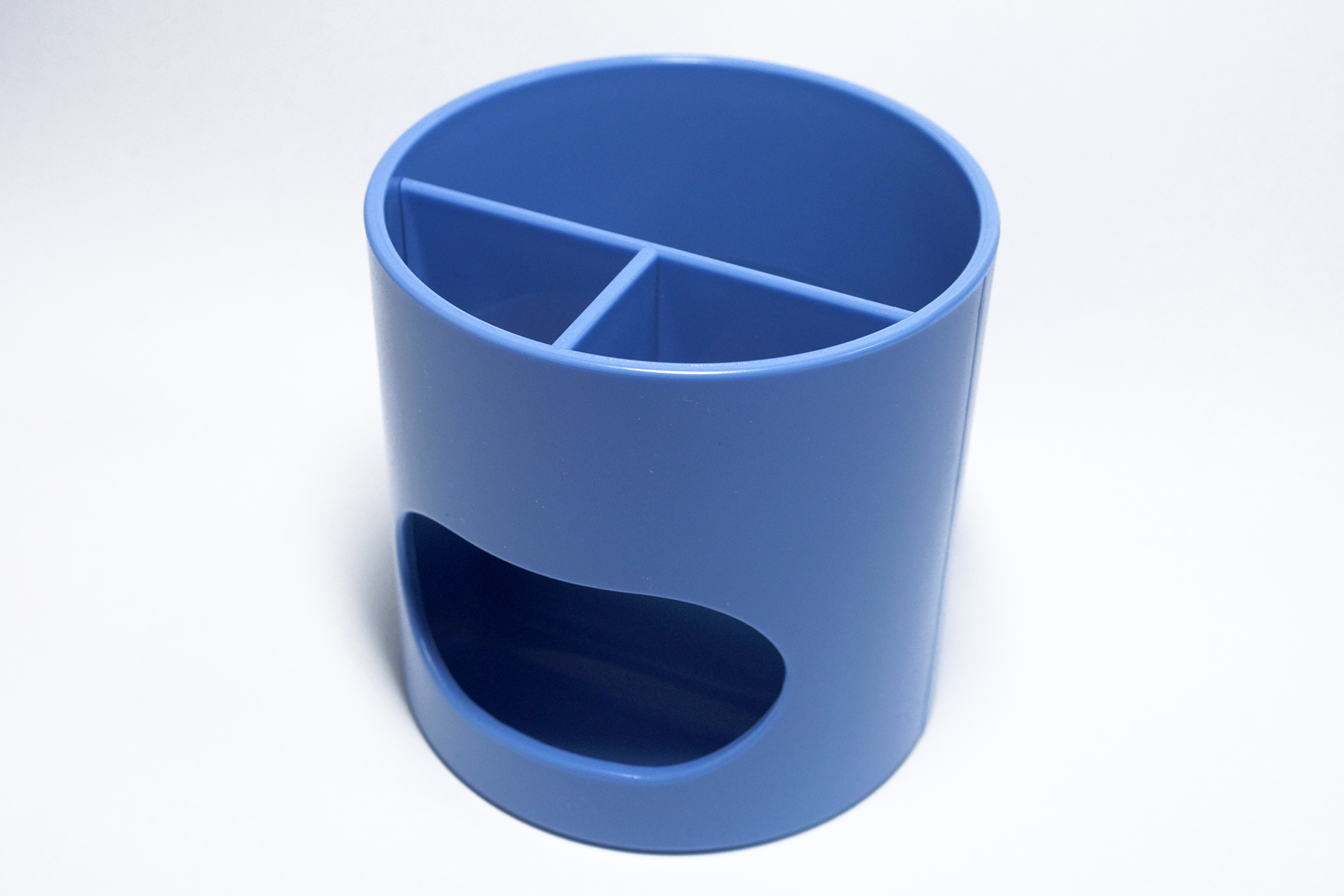 奥の半円がペンを立てるために深くなっており、手前の仕切られた半円は浅く、消しゴム程度の大きさのものを置くようにできています。