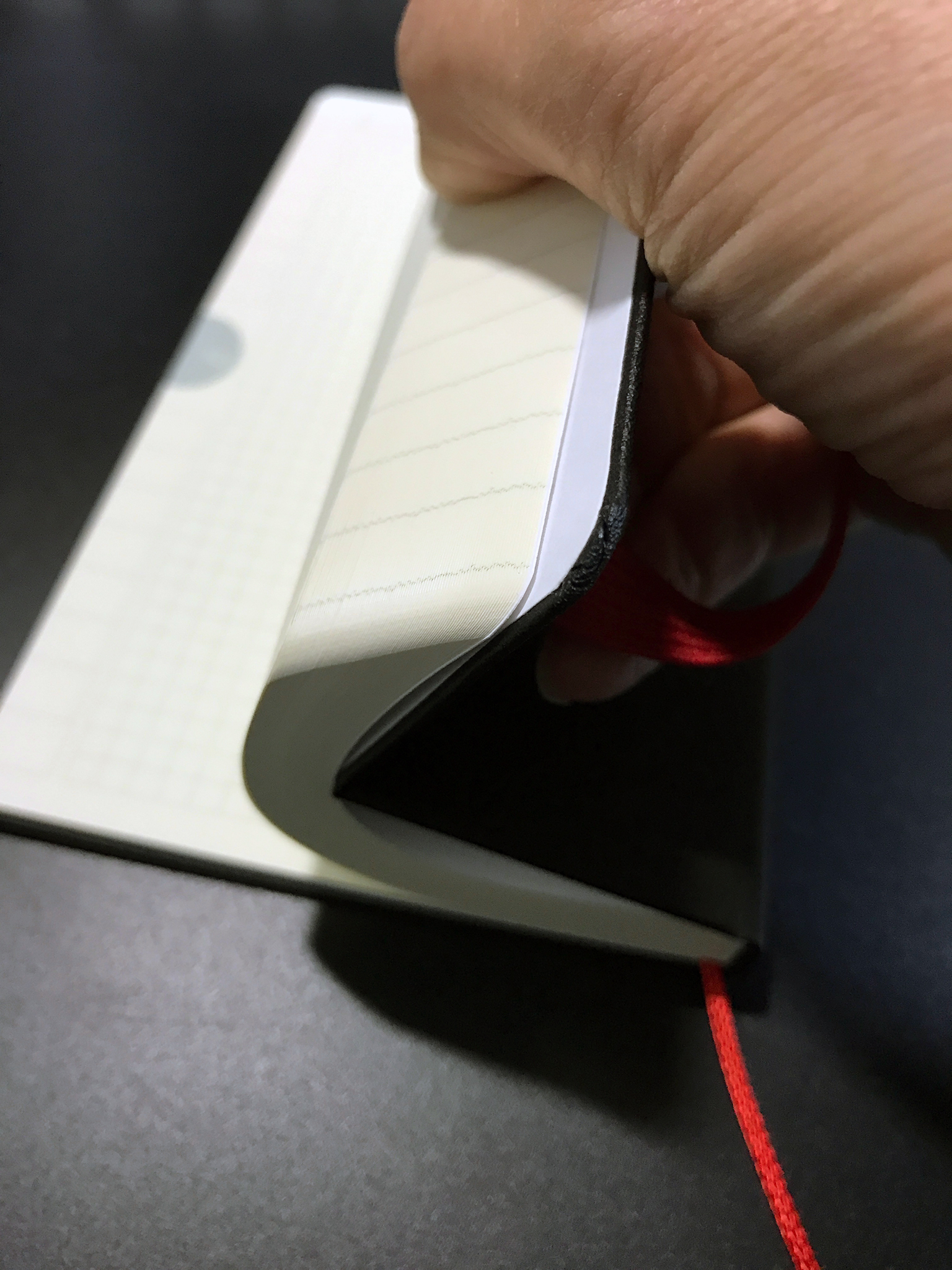 ページナンバー部分を押さえてぐいっと開くことにより、ページを繰る速度が格段に上がります。その時に威力を発揮するのが、この「折れる背表紙」。ハードカバーのノートにありがちな「書くのはいいけどページを繰りにくい」弱点を解消しています。