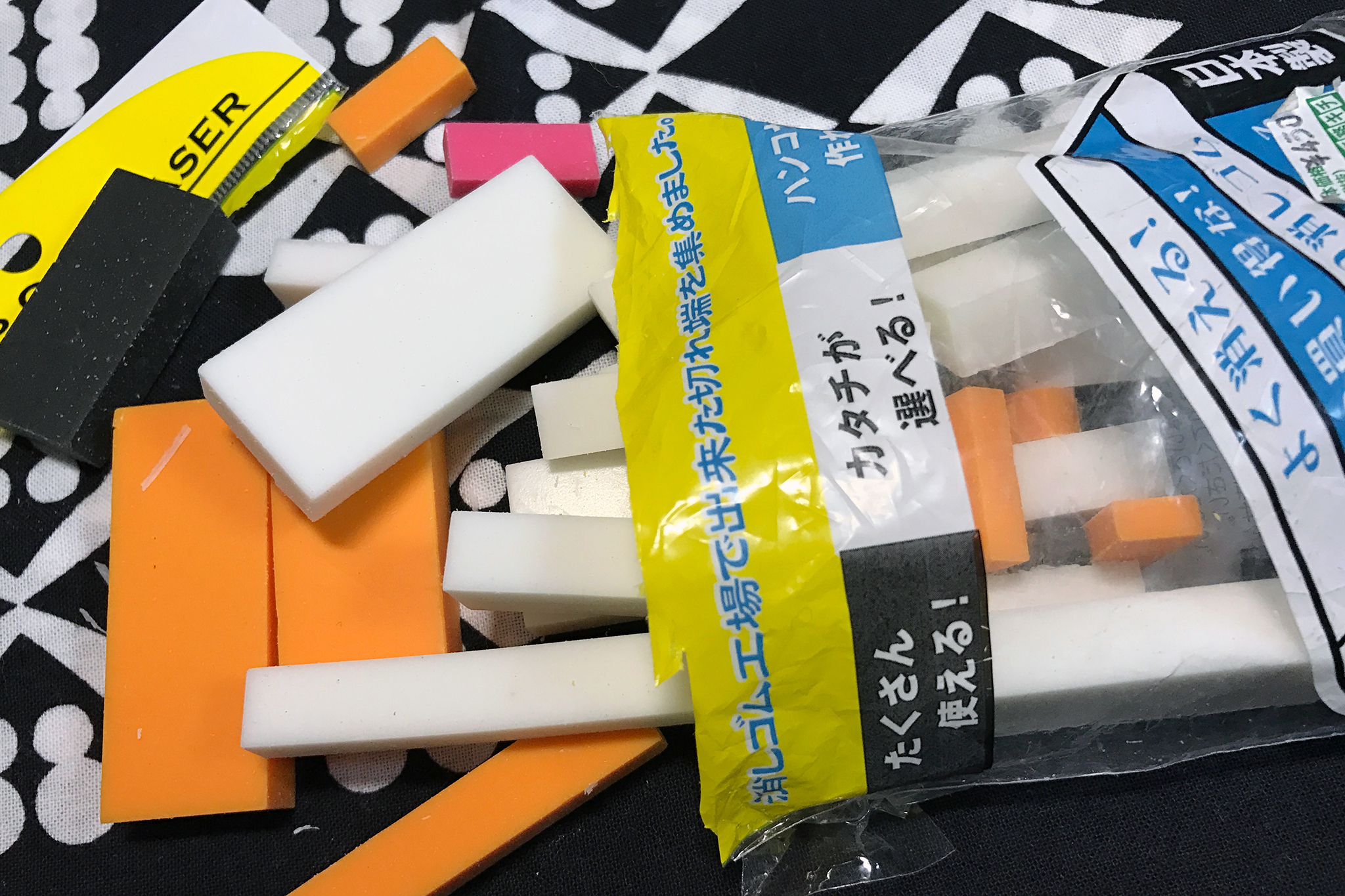 このミツヤのお買い得消しゴム、見つけるたびに購入しているのですが、最近はこんなカラフルな消しゴムも入るようになったんですね。