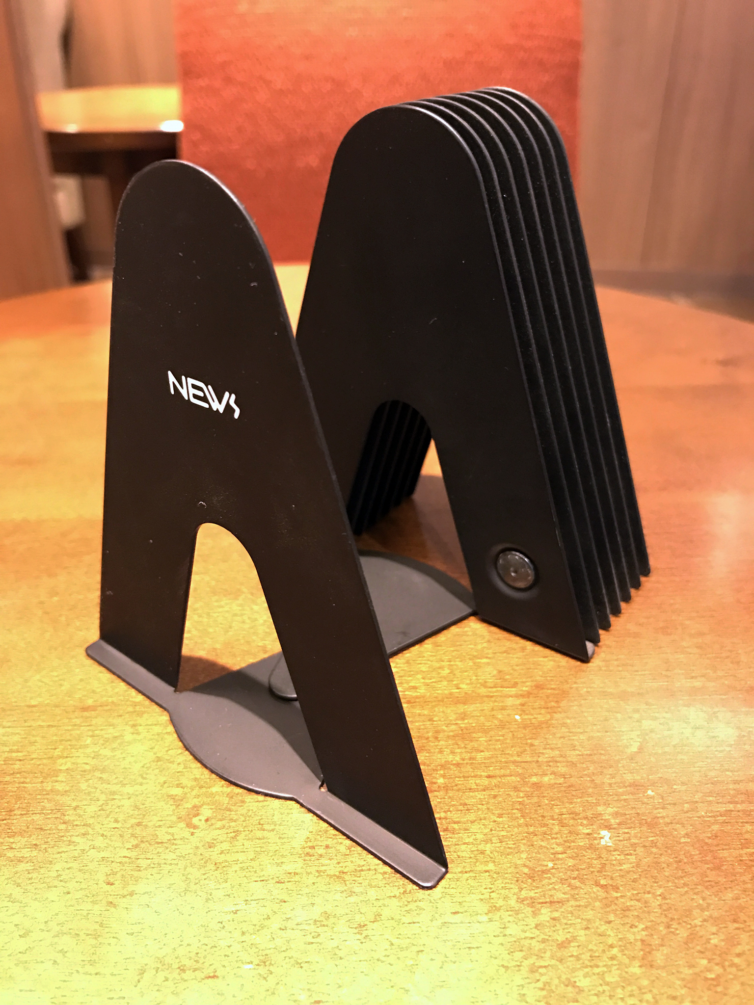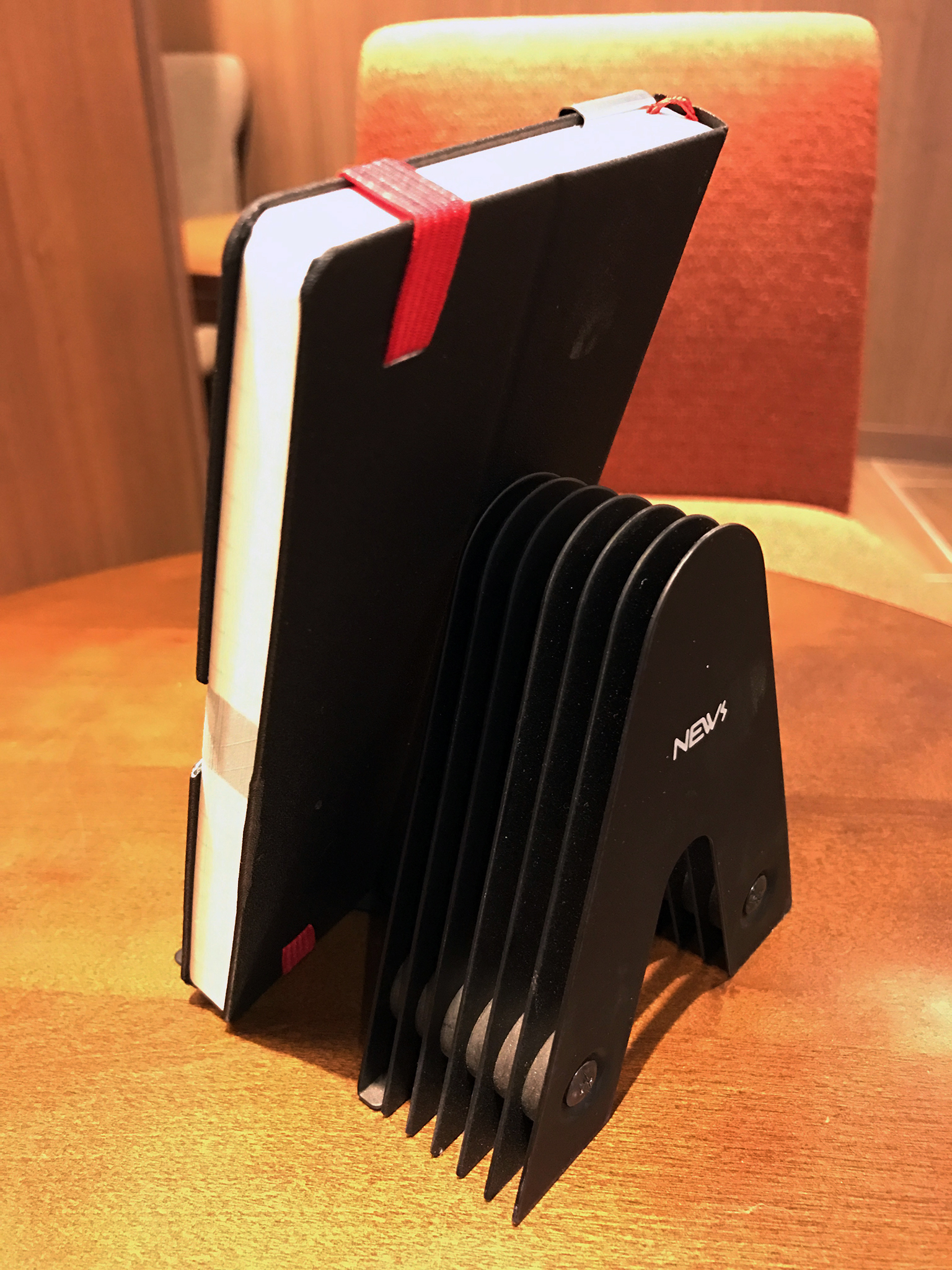 ブックエンド(A5判程度の大きさの本立て機能)とカードホルダ(カードなどを6枚立てておけるスタンド機能)を合体させたものです。