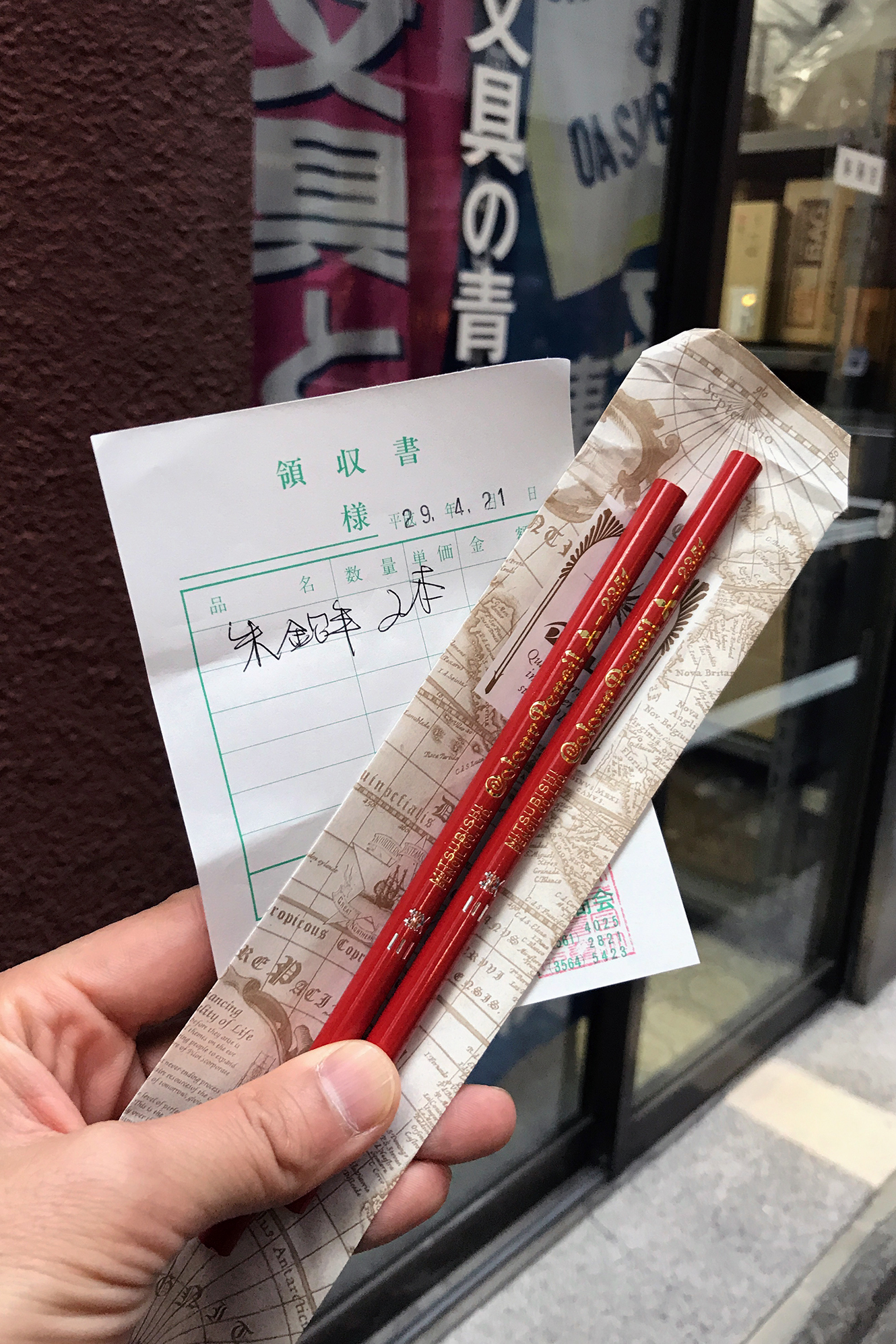 「落下衝撃で芯が折れない赤鉛筆」(正確には「中心軸にずれがなく、軸である木と芯の間の隙間がないため中で折れにくい赤鉛筆」)を北星鉛筆に特注してもらった上での実験です。