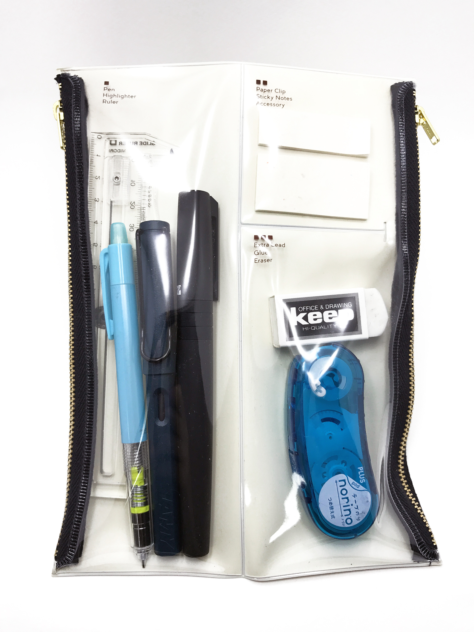 大中小の3ポケットに分割されたビニールペンケースで、拡げた状態なら薄く、二つ折りして背面のスナップで止めると細長い通常のペンケース形態にもなる製品です。