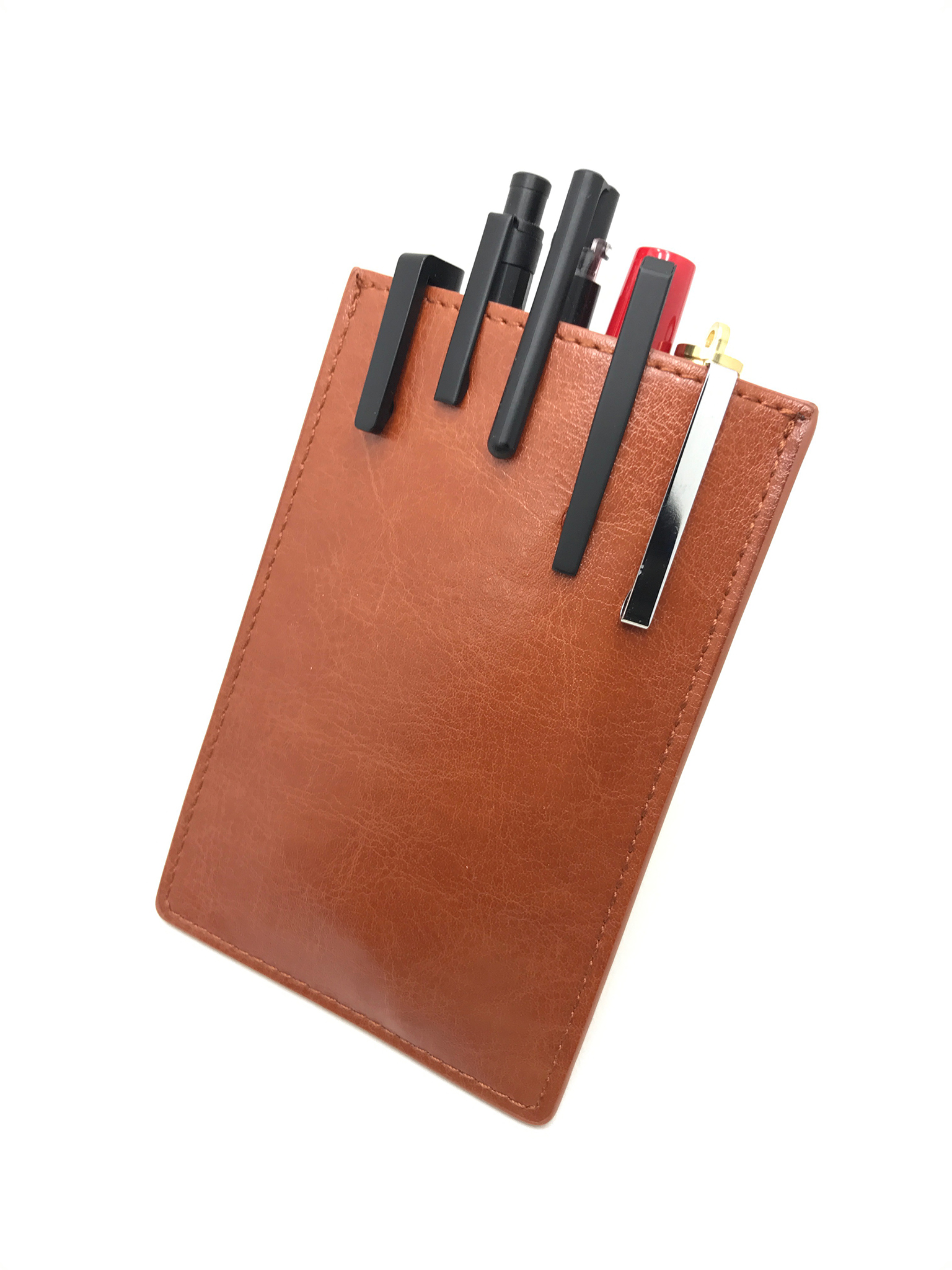 胸ポケットに入れてポケットガードにもなる小型薄型のシンプルなペンケースで、入れたペンはクリップで留まっているだけのサック(袋)状態です。