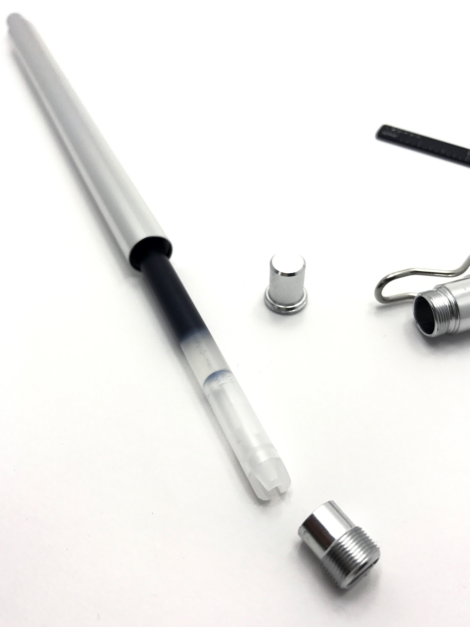 後方からペンシャフトにリフィルを挿入したら、リアキャップを入れて付属のL定規でゆっくりとリアキャップをねじ込んでいきます。
