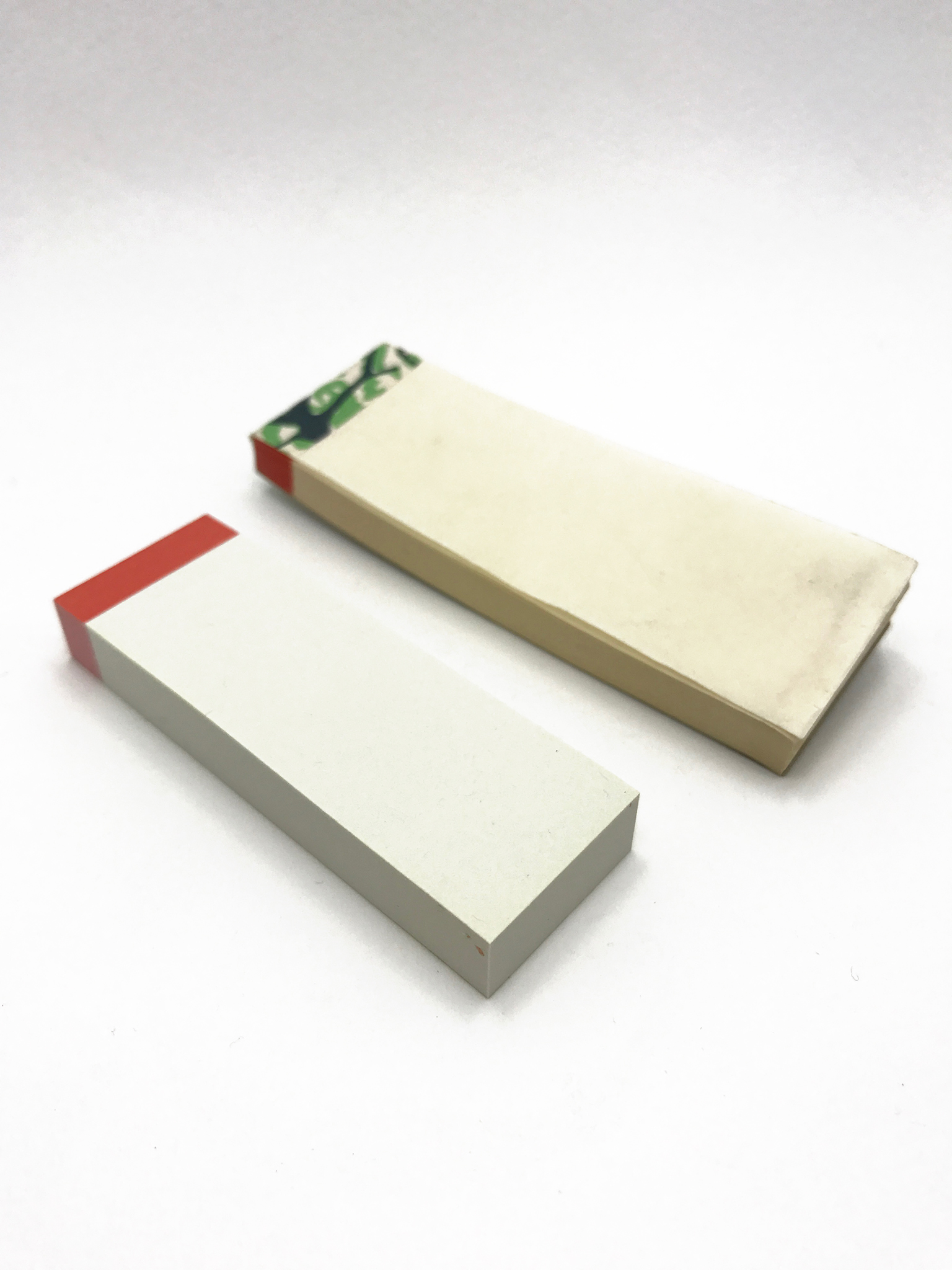 手前がポスト・イット、奥が「日本式の、端を赤く塗った付箋紙」です。