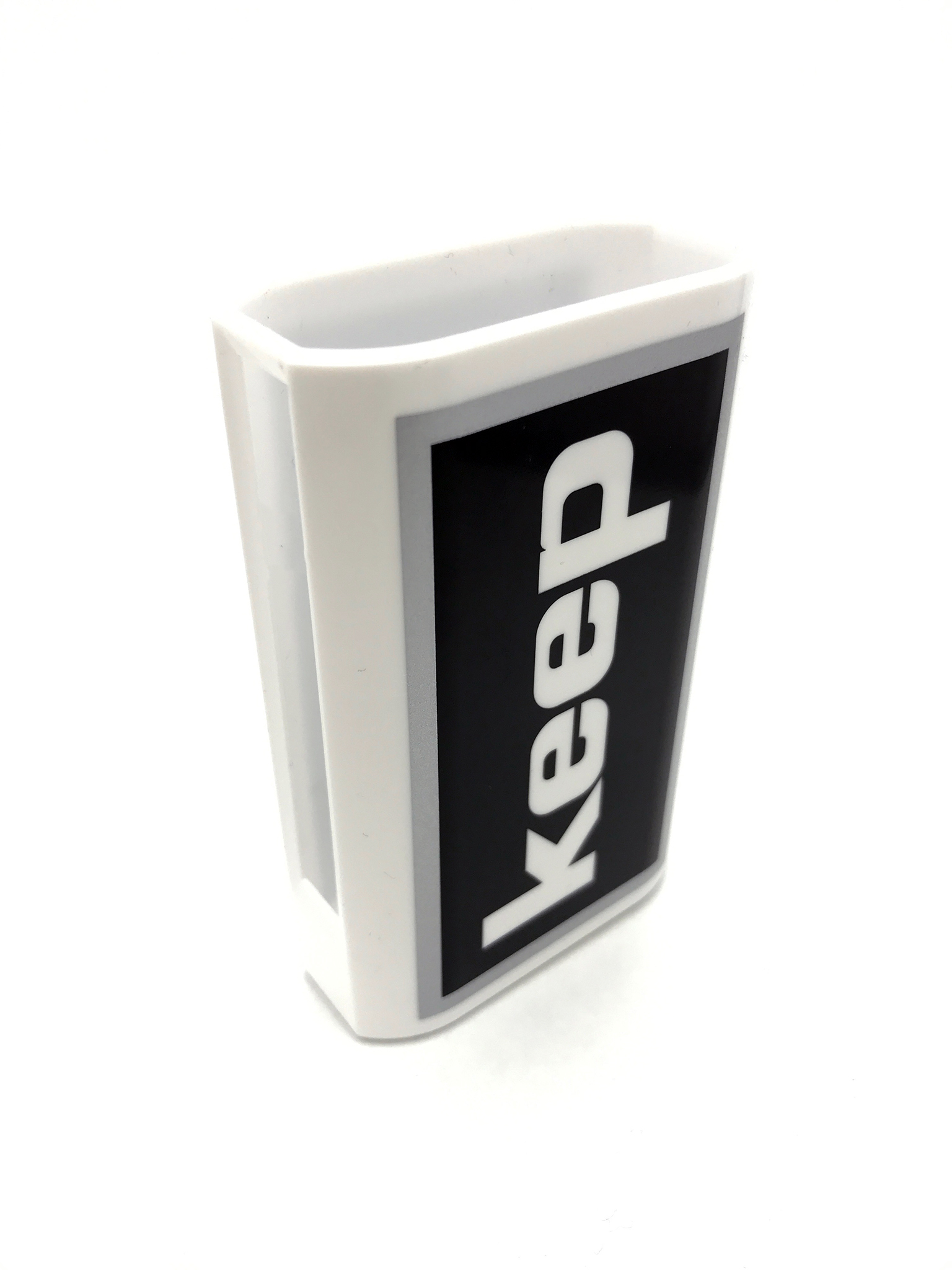 ただ、ファンとして嬉しいのは、keepのロゴに対し右側が開いている(iQOSを使用する場合、可動する蓋側が飛び出る)こと。白いiQOSケースの飛び出した蓋部分が、ちゃんと「keepロゴの右側に消しゴムが出る」keepの特徴を押さえて設計されている。これはすばらしい。