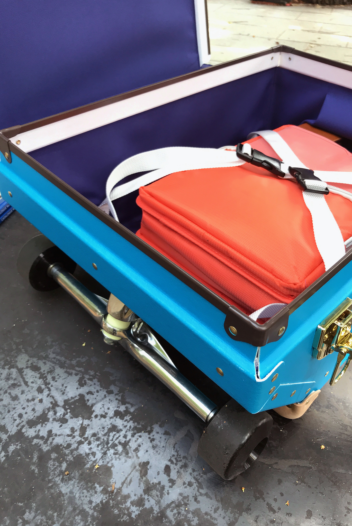 内容物はベルトで固定が可能です。ただ、2輪なので底面が三角形にえぐれており、平らな部分がありません。ベルトで固定できる程度の重量物(衣類など)であれば問題ないかもしれませんが、段ボールに詰め込んだ本とかを運ぼうと思ったら、この底面の三角柱的スペースに布を詰めるなどクッション機能を持った何かを入れる必要があるかもしれません。