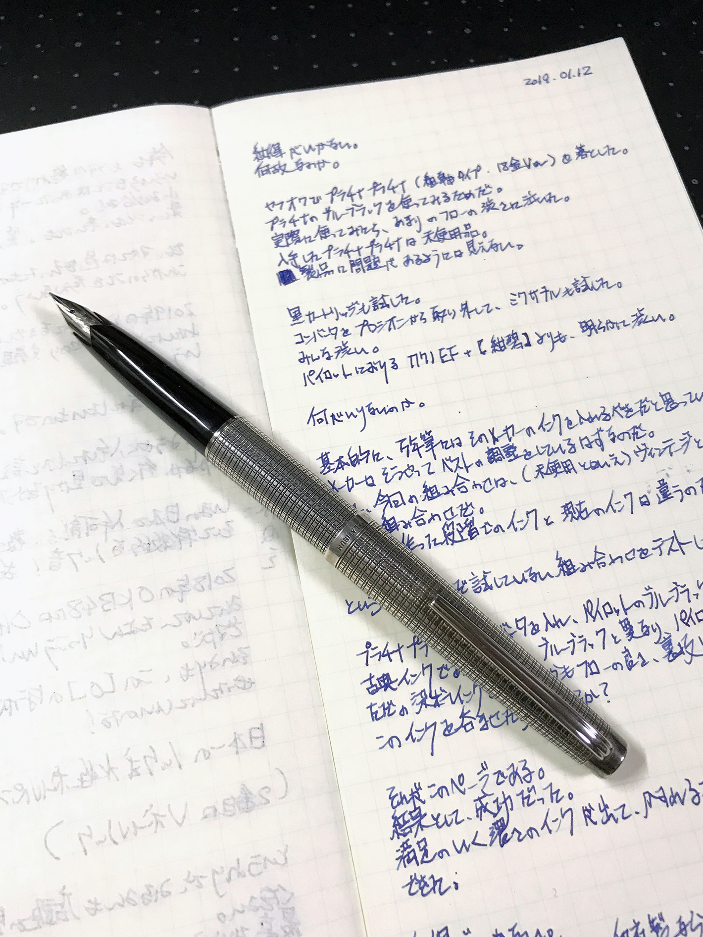 「格子柄金属軸にプラチナのブルーブラック」という本来の目的は達成できませんでしたが、いまのところこの組み合わせに満足しています。