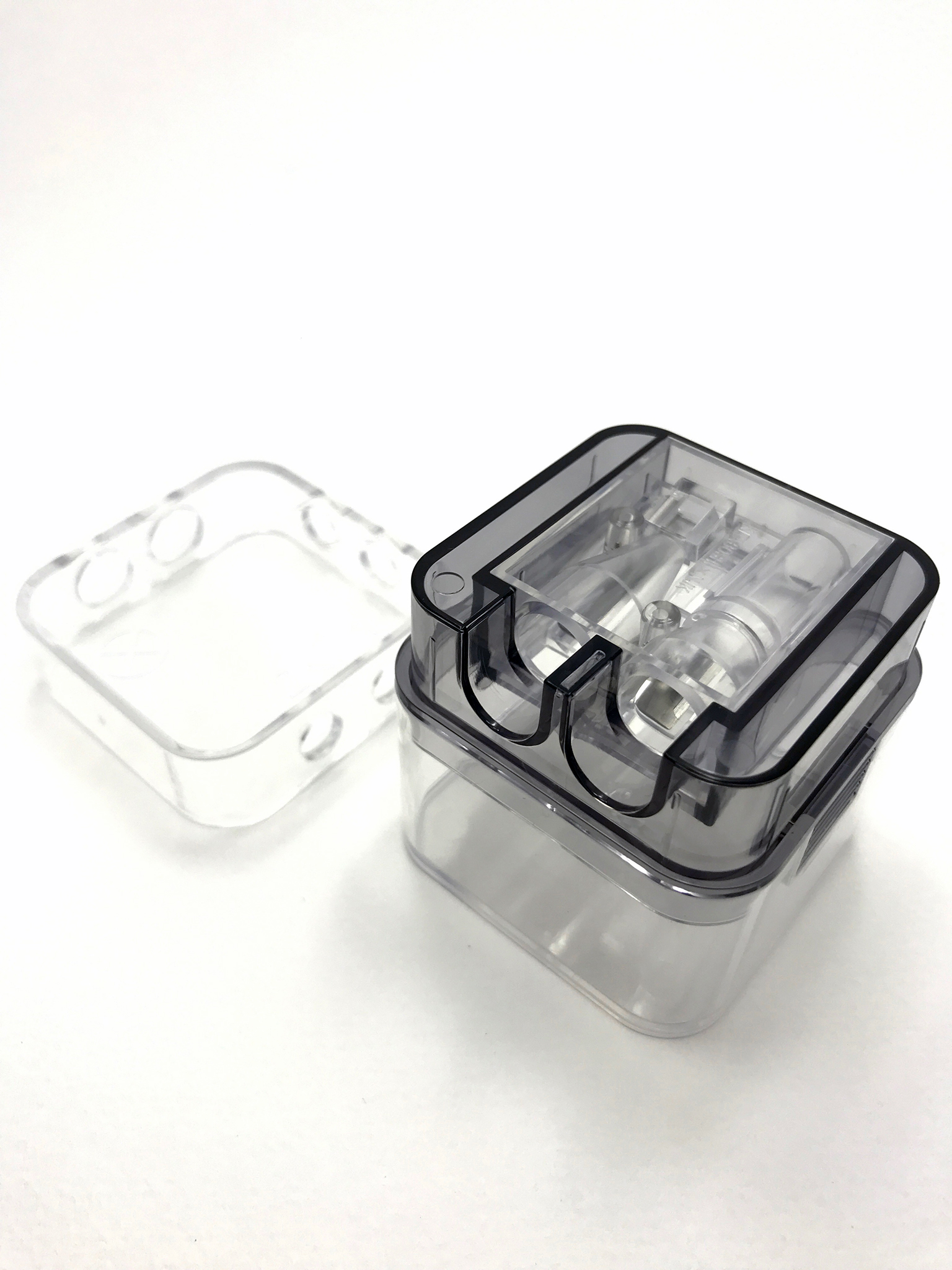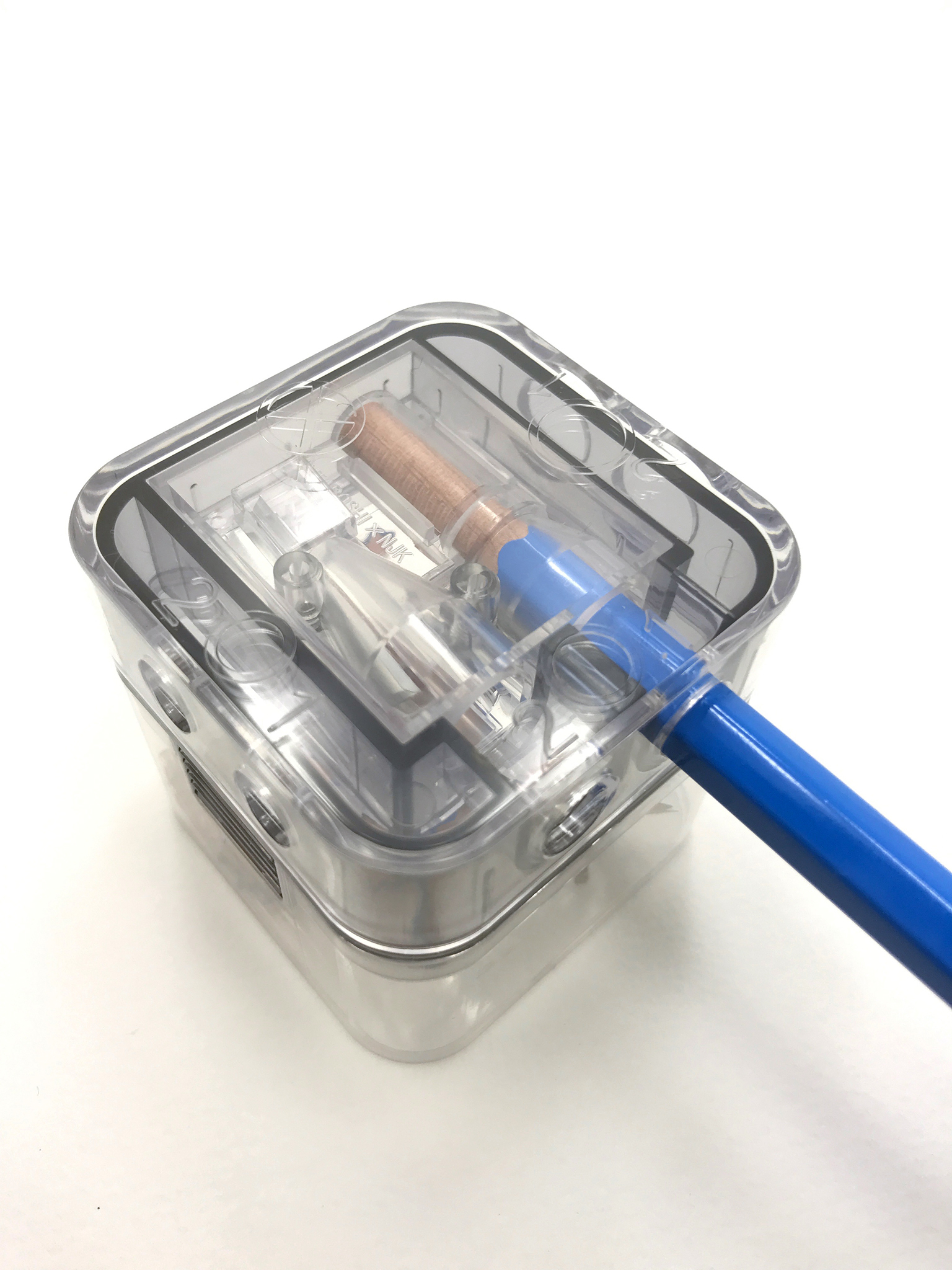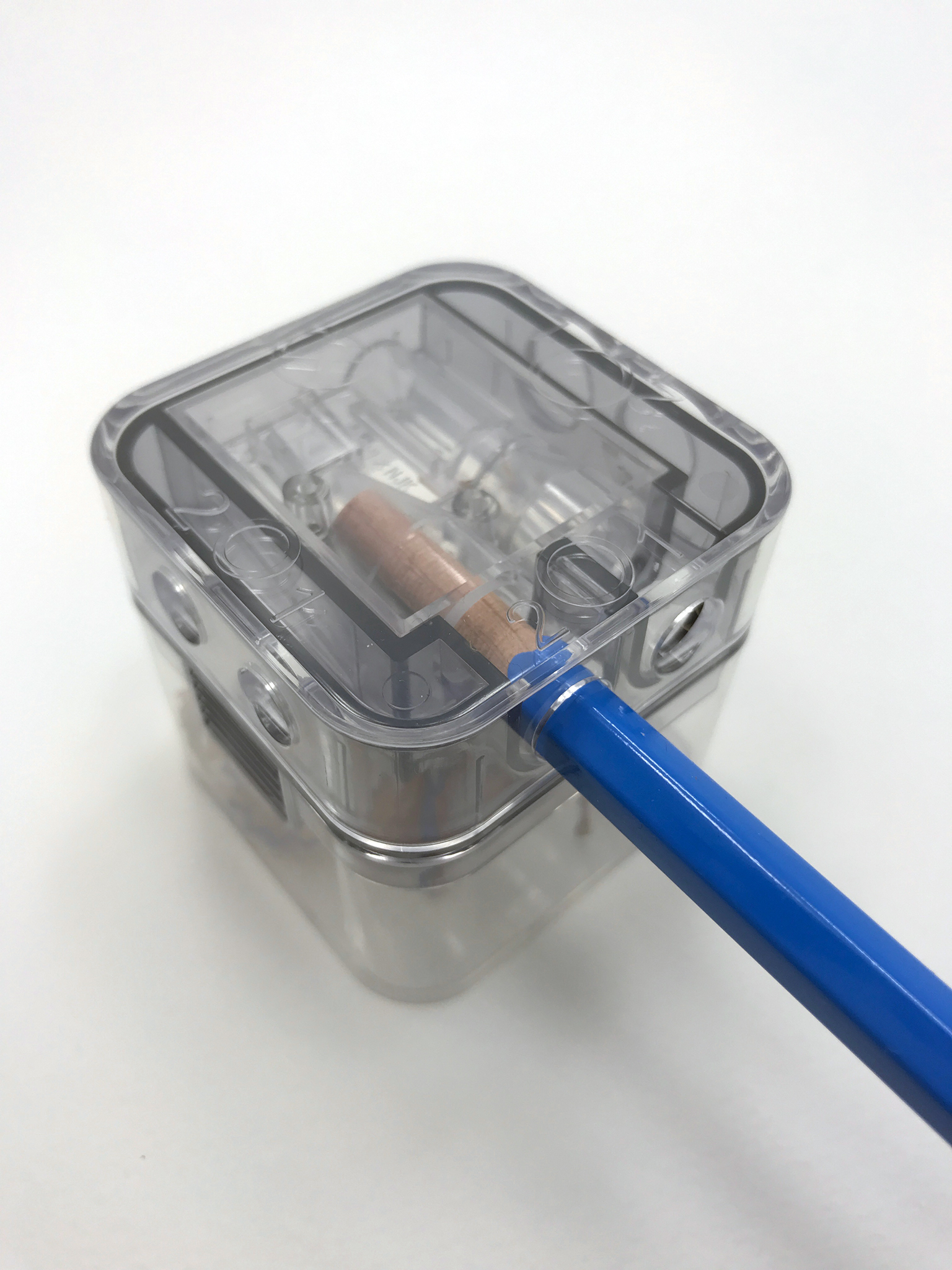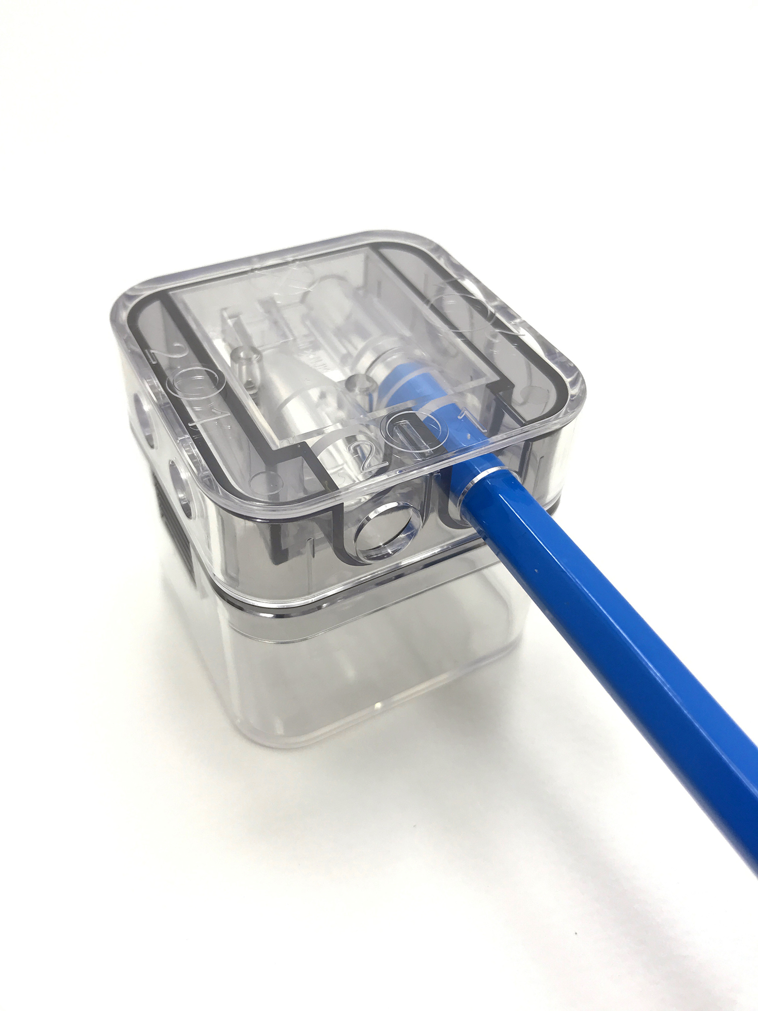 蓋に穴があいているのですが、四つの面にそれぞれ「細(直径約7ミリ)」「中(直径約8ミリ)」「太(直径約10ミリ)」の穴が空いていて、鉛筆の太さによって向きを変えてはめる仕組みになっています。穴のない面がひとつだけあり、そこを前にすると削りかすがこぼれないようになっているわけですね。