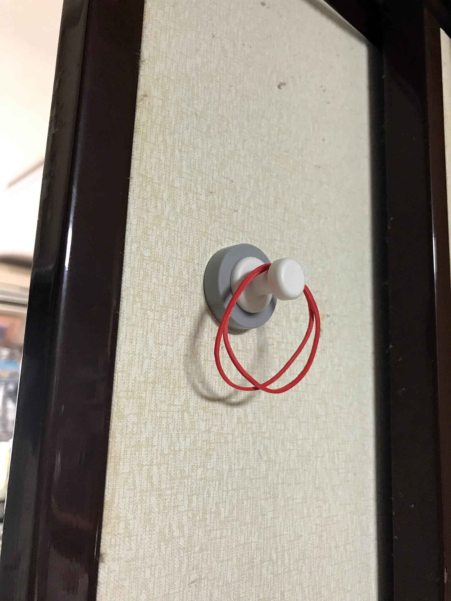 この襖はぴったり締めてしまうと弾き手が埋まってしまう関係から、常に15センチくらい出して完全収納しないようにしているのですが、手が届くところにフックが増えると便利べんり。
