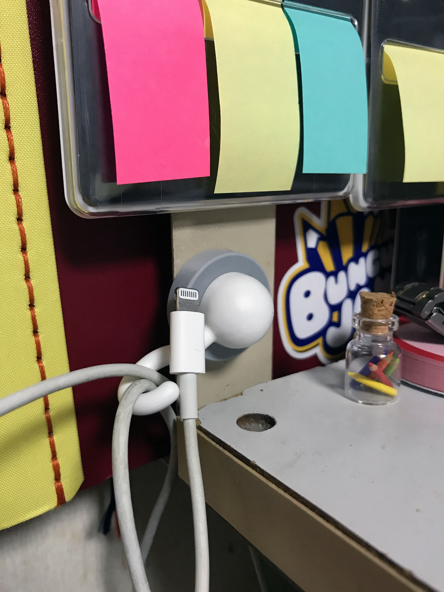 垂れがちな充電用Lightningケーブルをフックに引っ掛け、さらに端子部分をマグネットに触れさせておくと、だらりとせず取り出しも容易になります。