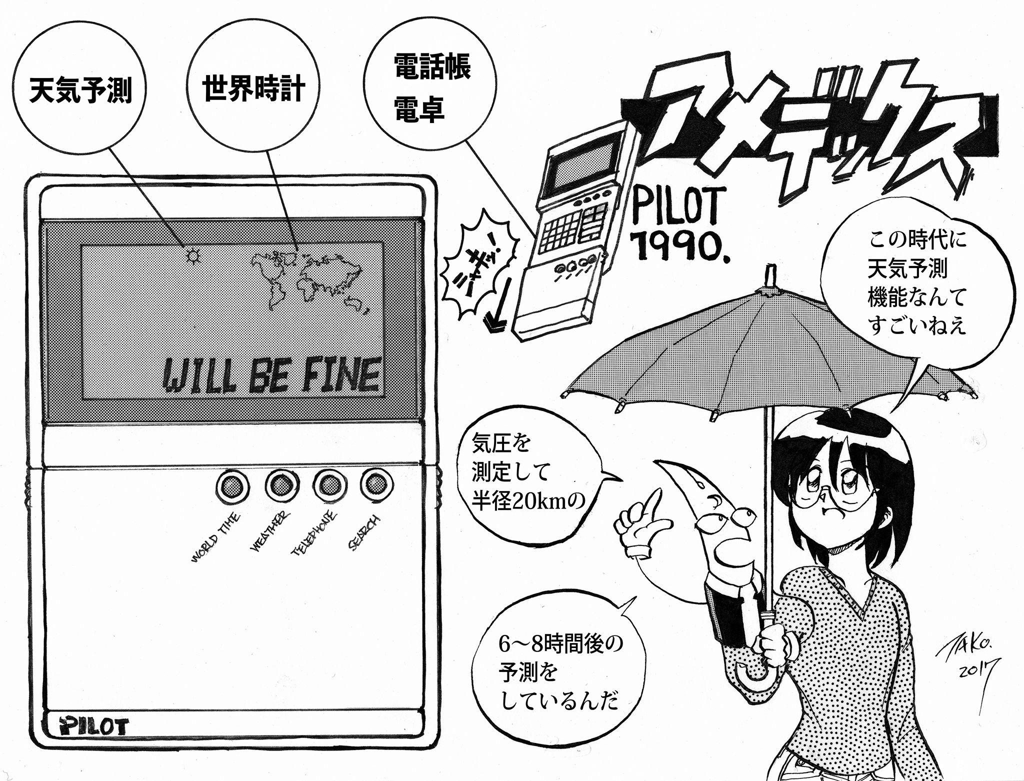 天気予想を内蔵したアメデックスの発売元は、株式会社パイロット(現・株式会社パイロットコーポレーション)。今となっては万年筆とフリクションボールで筆記具メーカーの王道を行くパイロットだが、当時はこういうクセダマもたくさん放っていた。