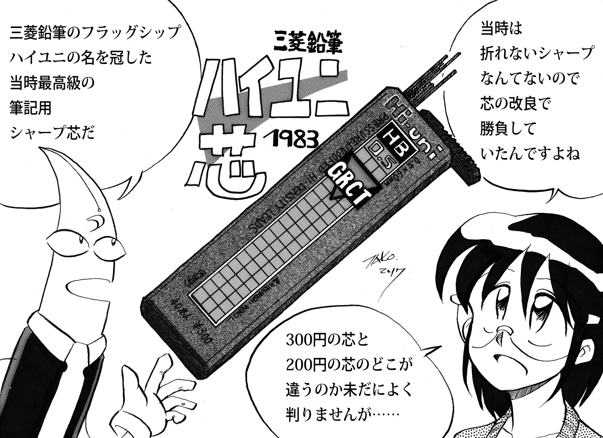 中学の頃からシャープ芯はuni芯一辺倒で、使い潰した芯の本数は枚挙に暇がない。そして高校時代になって現れた高級シャープ芯Hi-uni芯が、ここからわたしのスタンダードとなって授業に、受験に、そして漫画に消費されていく。より折れにくくなったことは事実だったが、それより「もう中坊ではない」というか、高級な芯を使うことにより少しずつ大人に近づいている背伸び感も心地よかったのだろうと思う。