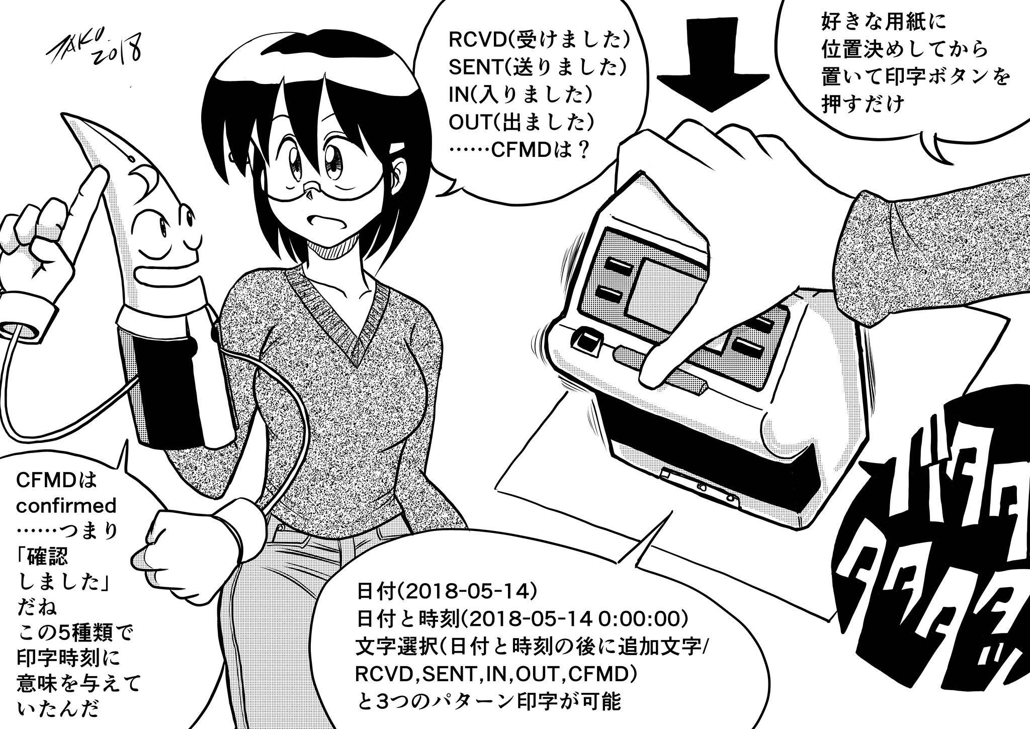 そして、使用する内容によって日時のあとにコメントを入れるモード。5つの文字(RCVD、SENT、IN、OUT、CFMD)をつけることができる。