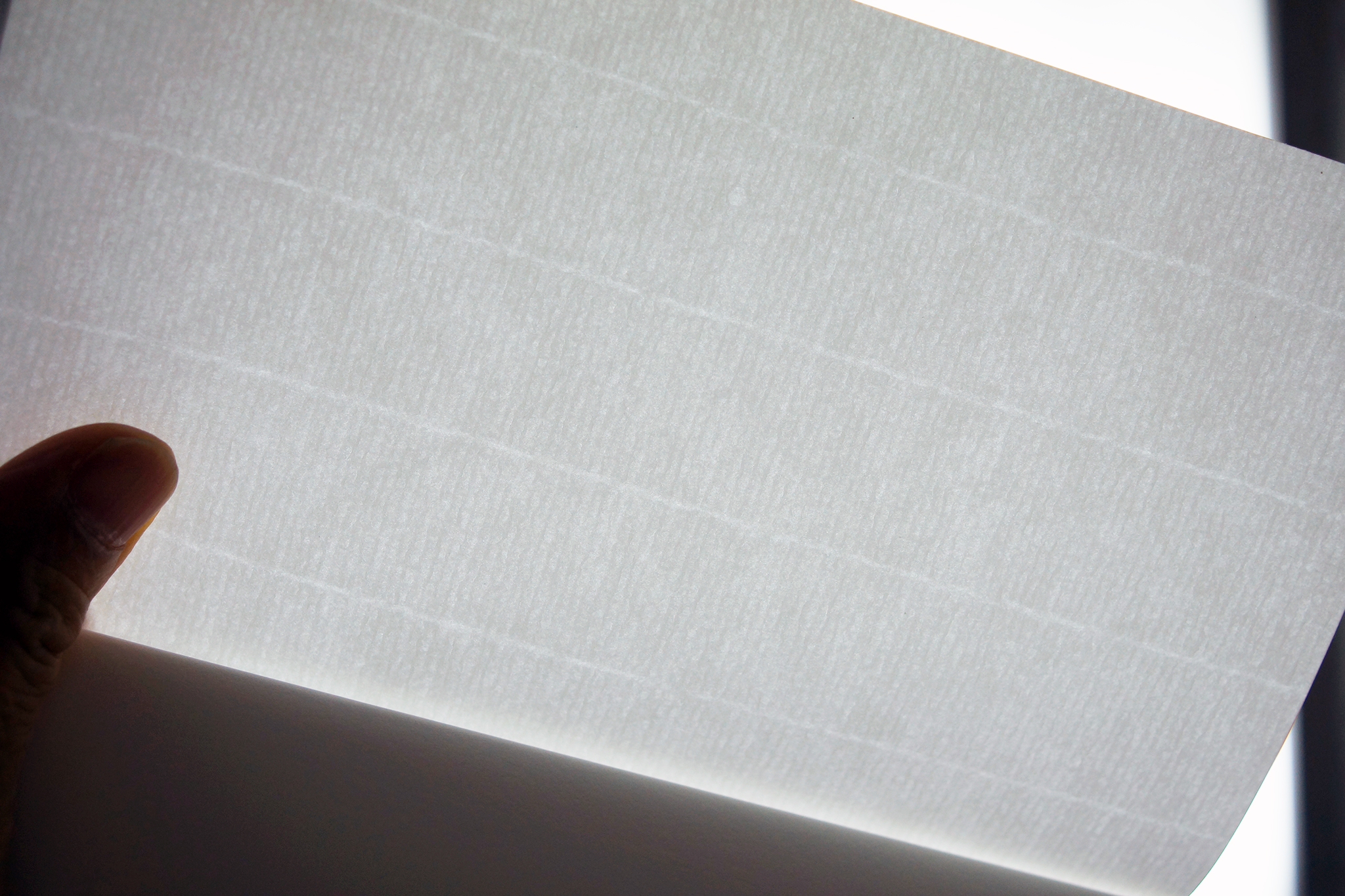 Lライティングペーパーの証である簾目レイド模様が美しいですね。レイド模様はその規則的な模様が光の反射を軽減するため、長時間筆記使用された場合のユーザーの目の負担を和らげる効果もあります。
