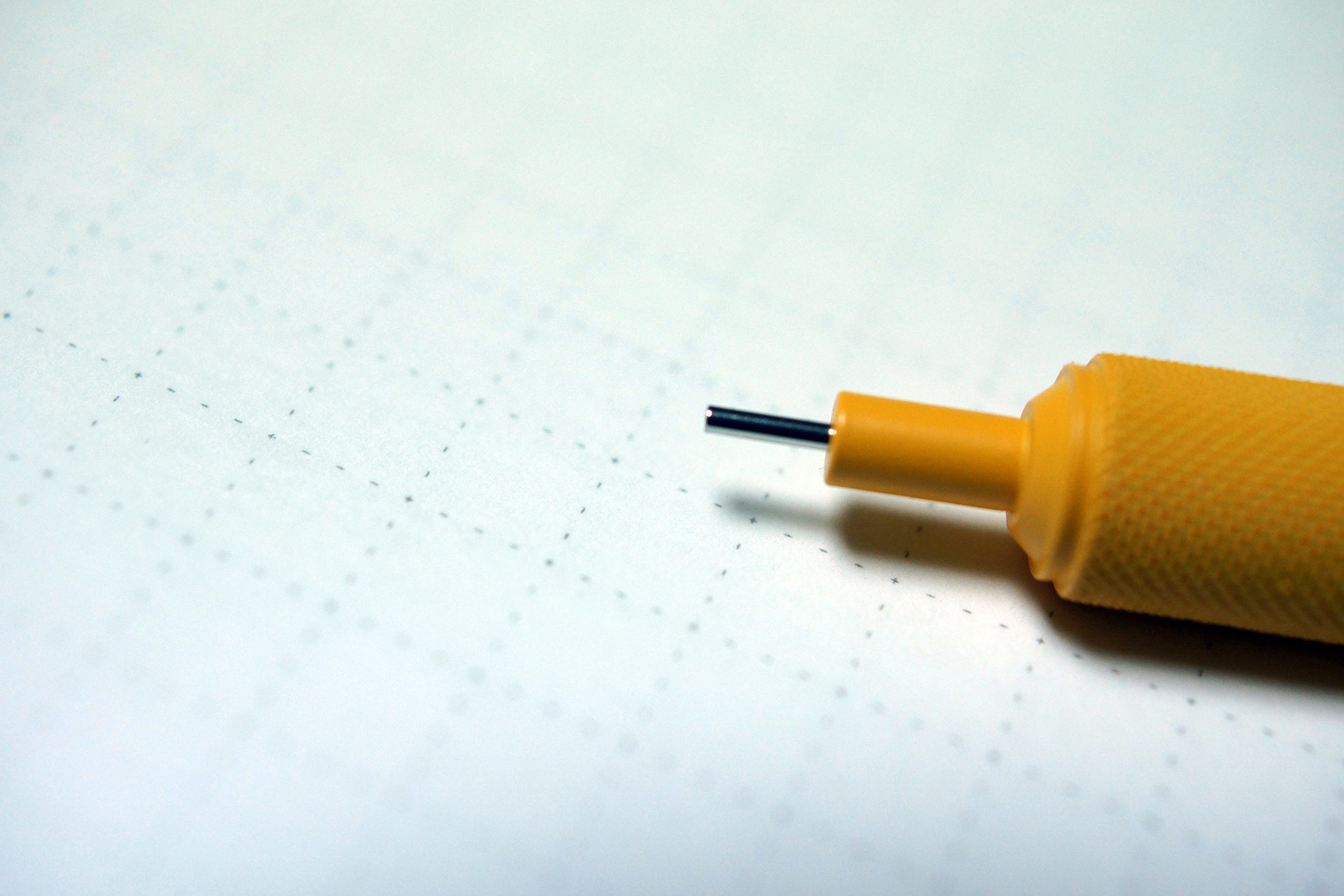 5mm罫線と5mm方眼は、ともにドットでできた薄いグレーの罫線で、存在感が希薄になるようデザインされています。また罫線をドットにしたことにより、万年筆などの水性染料インクで書かれた文字を弾きにくくなっています。