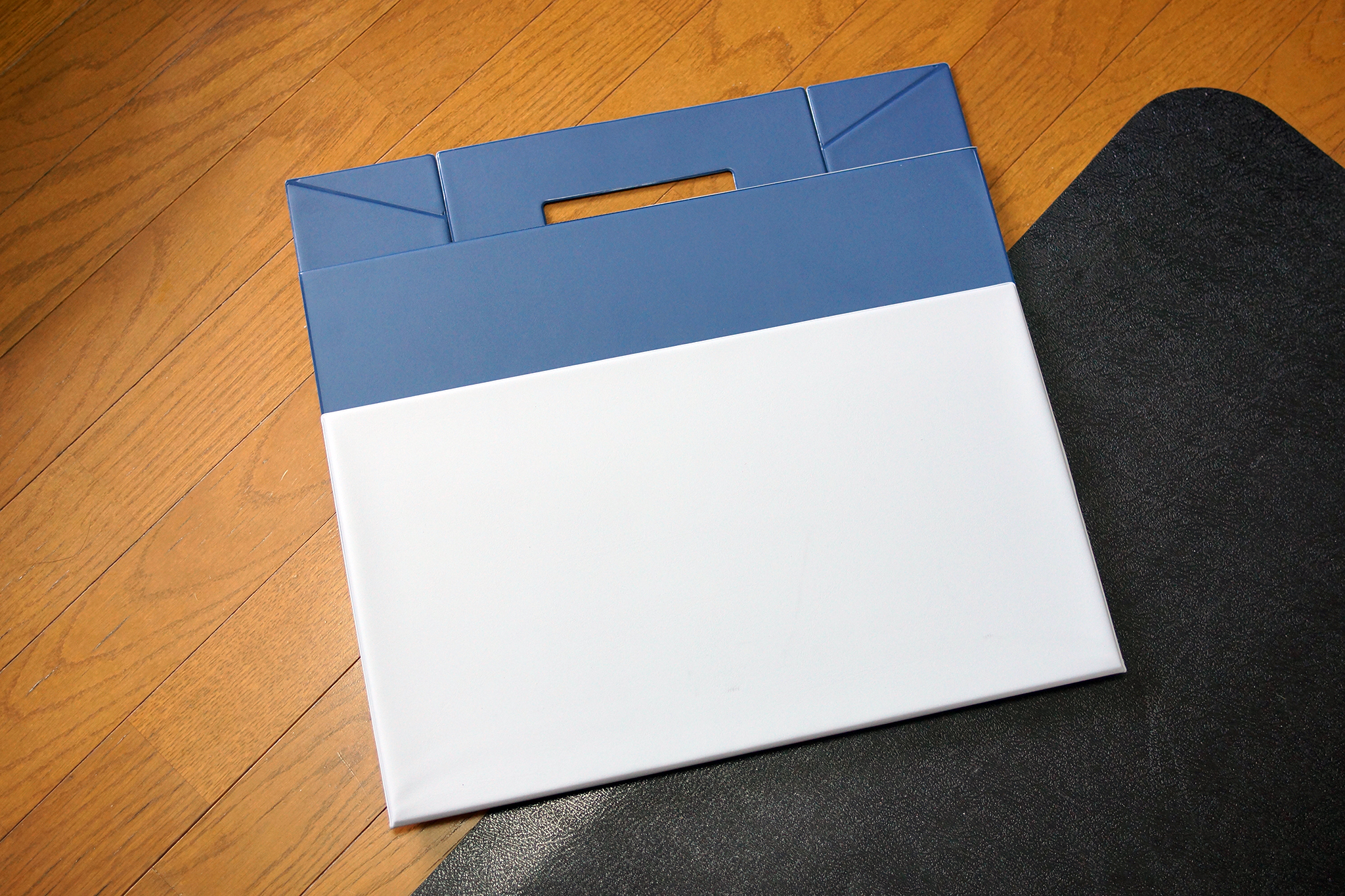 折りたたんだ状態の大きさは幅450mm、奥行425mm、厚みが20mm。重量は1,550gと、見た目より重いです。把手状の窪みがあって持ち上げる際に補助になるのですが、把手がちょっと手に食い込む感じがします。もっとも、本製品は持ち運んで様々なところで使うというよりは、使う机の脇に畳んで置いておくことがメインだと思いますので、持ちやすさ云々はそこまで重要な要素ではないのでしょう。