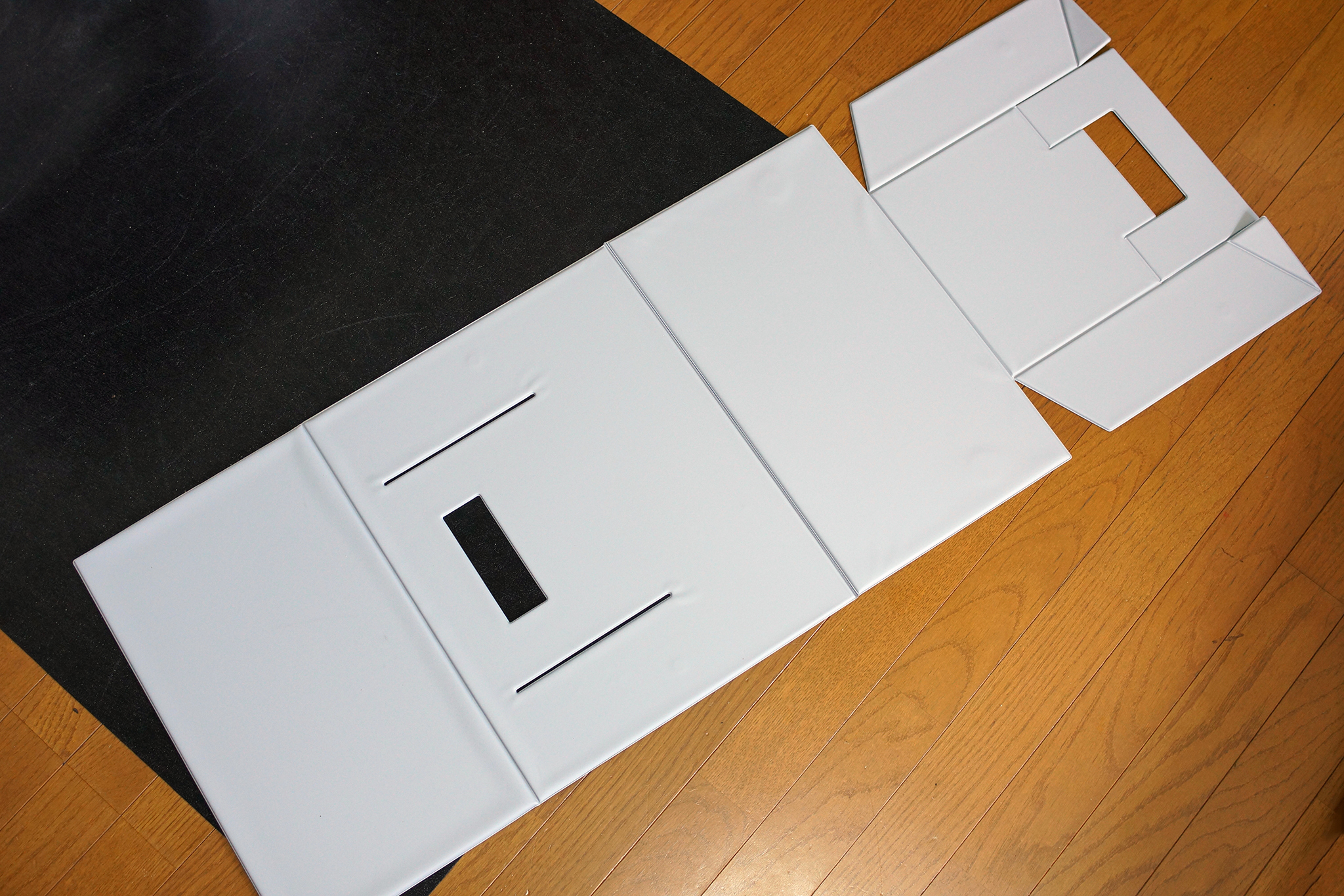 組立は簡単です。パタスタはネイビー、ブルー、ホワイト、ブラウンと4色で展開されていますが、すべて裏面はグレーです。まず、このグレーの面が上になるように開いて置きます。