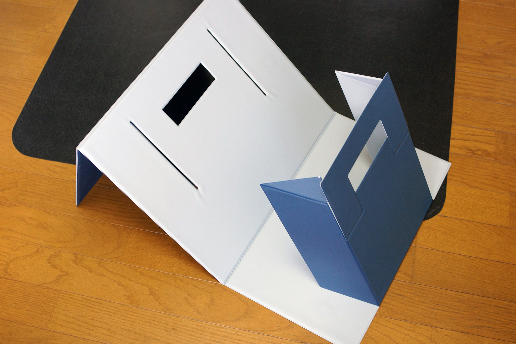 折り曲げた山には縦に細い2本のスリットが空いています。ここに、さきほど把手側で折り曲げ立たせた先端を挿入します。挿入ののち、把手パーツだったコの字の部分を折り込むと、挿入されたパーツがグッと奥まで入り込みます。