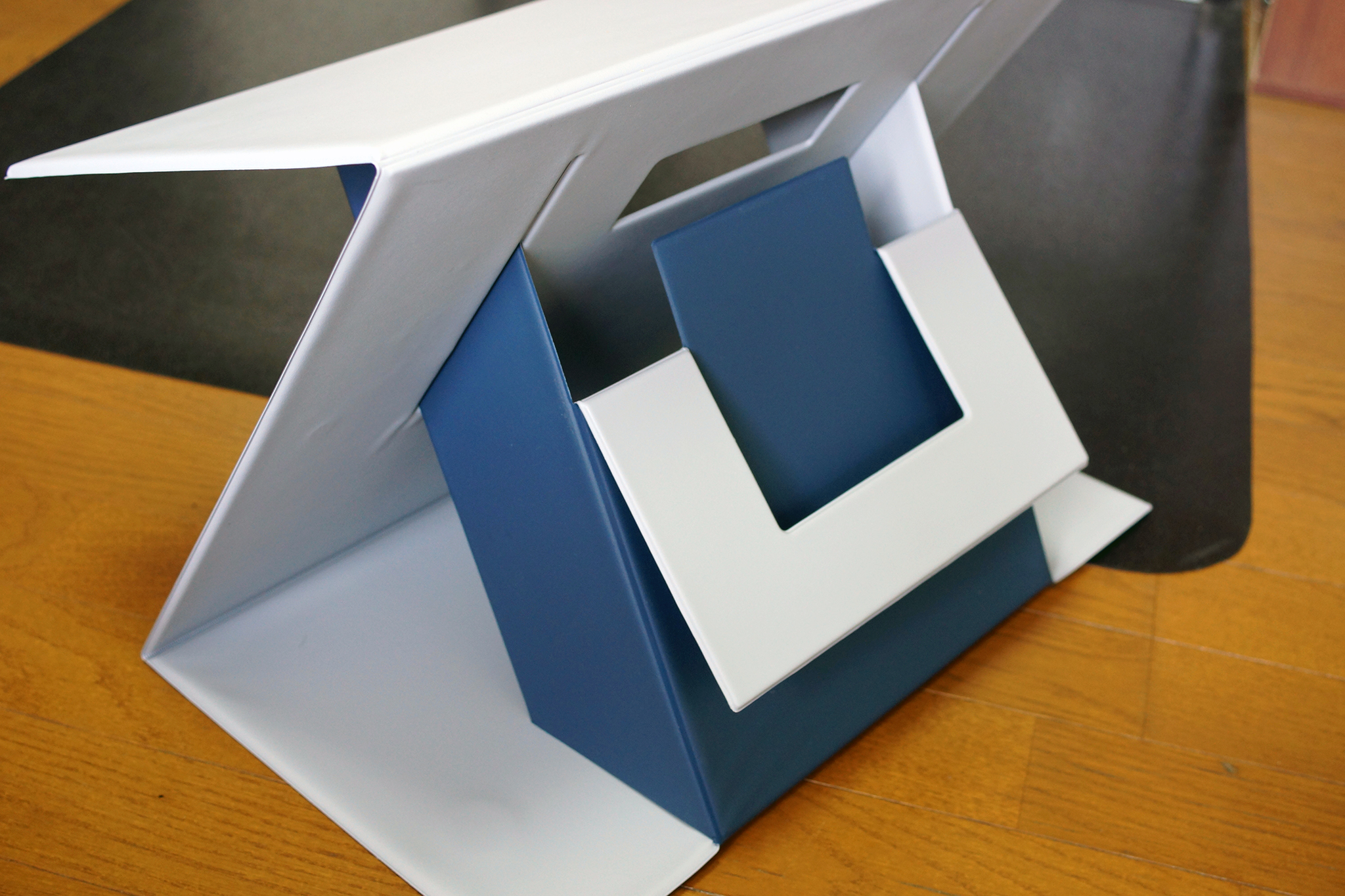 パタスタは芯材であるボール紙をPVCのカバーで覆った、組み立て式のPCスタンドです。購入時はひらべったい状態でダンボール個装されています。