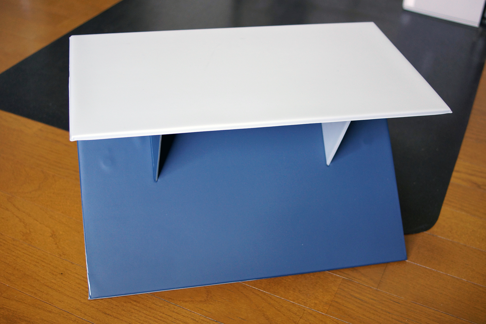 固定される位置まで挿入されたら、パーツ先端を内側に折り込み、残った上部パーツを載せると完成です。思った以上に簡単に、スタンディングデスクのできあがりです。