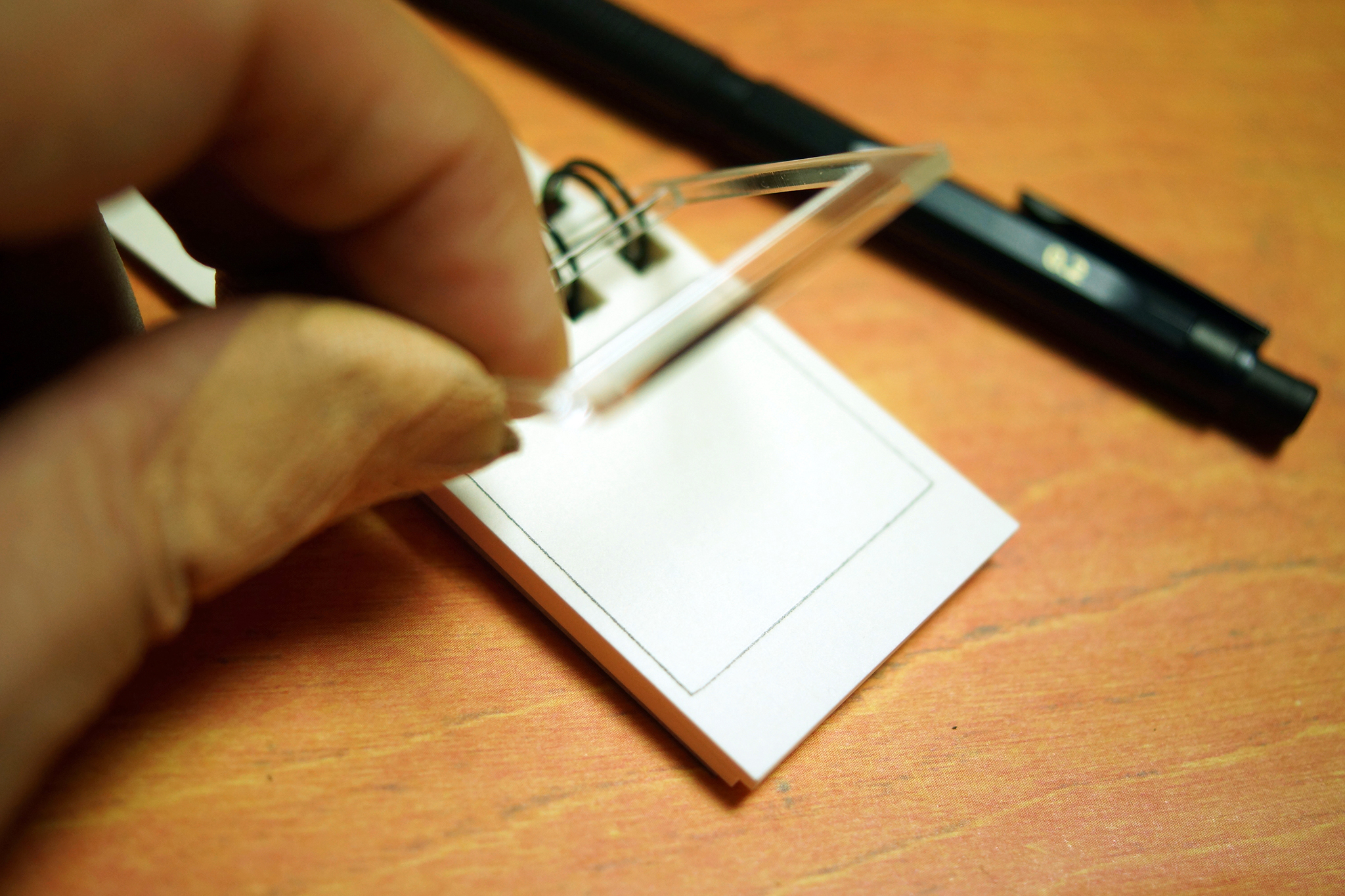紙面はリング穴から換算して、縦43×横38mm。分厚くて本格的なスケッチブック用紙です。かなりコンパクトでちいさな用紙ですが、それでも「紙いっぱいに描くのはどうも」と躊躇される方もいらっしゃるかも。