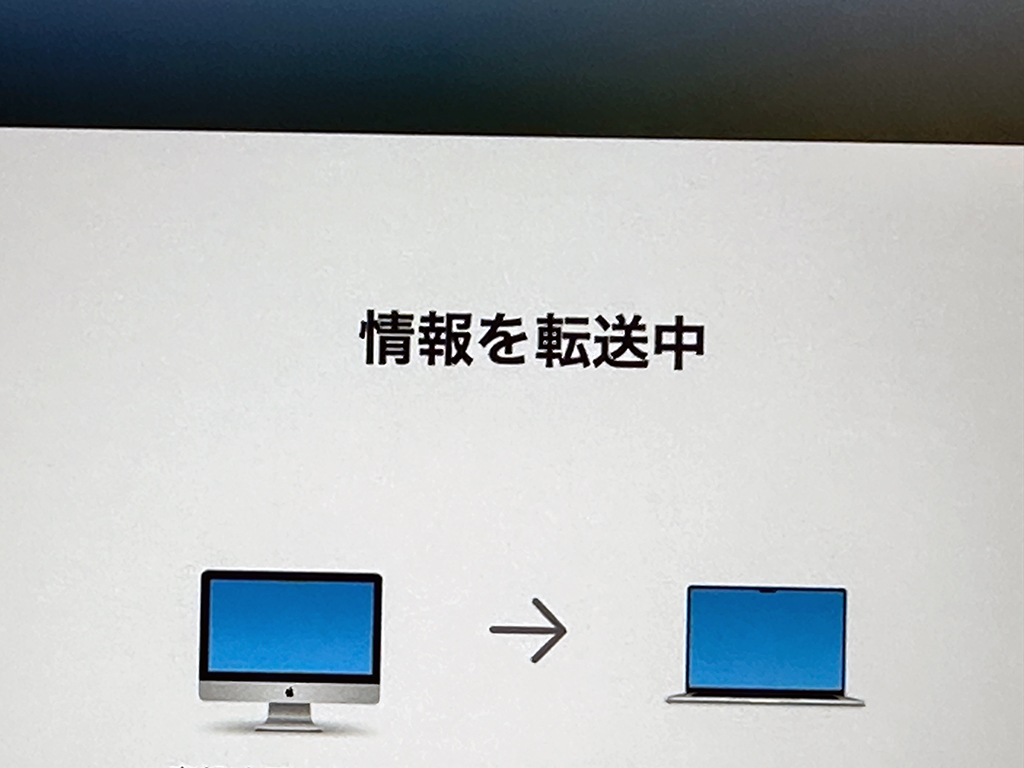 購入したらまずMBA M3本体を電源につなぎ、起動画面から手順に従って、古いMac(ここではiMac)からMBA M3へデータ転送を行います。