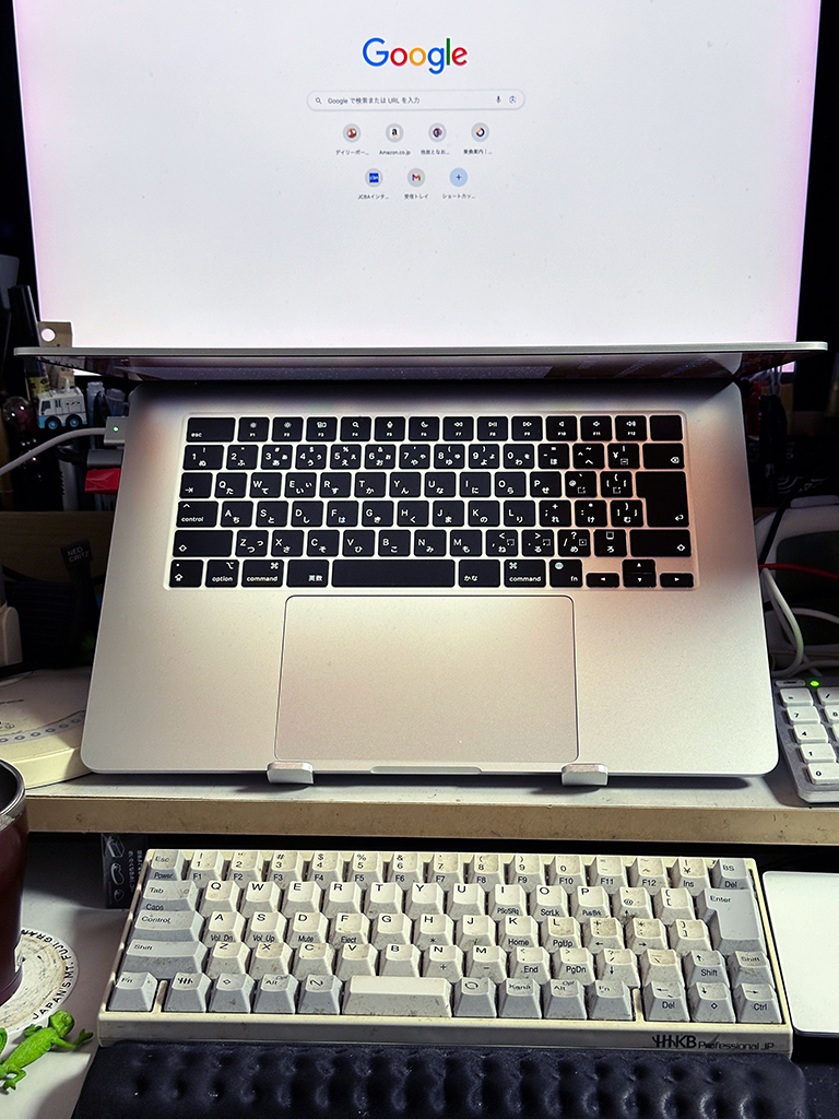 本当はデュアルディスプレイなので、並べたり側面に置いたりできるといいのですが、我が家にはそんな広間はないので、MBA M3はど真ん中で半開き状態。クラムシェルとしての使用は想定していません。