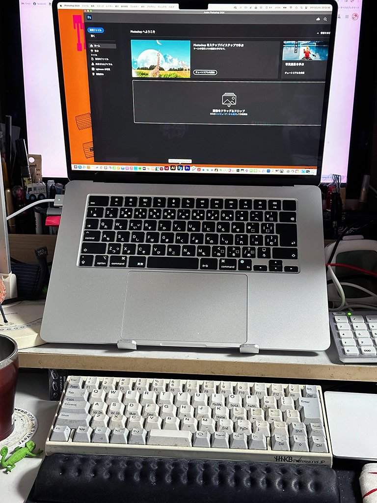 デュアルディスプレイですから、MBA M3のモニタを上げればもうひとつの画面が登場します。iMacの21インチではもっぱらブラウザを、こっちで動画や音楽の再生、Photoshop、Illustrator、InDesignの作業を行うことになりそうです。ただ、大画面のほうが作業しやすいInDesignに関しては、iMacの21インチが作業場になるかもしれません。どっちがいいかな。