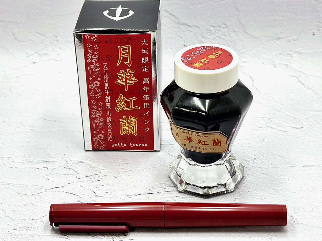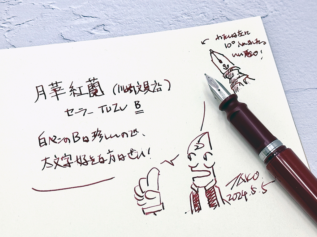 というわけで、書いてみないとやっぱり捻り角度がどうとか実感が沸かないので、今回は本体色に合わせ、川崎文具店の「月華紅蘭」を喫わせます。