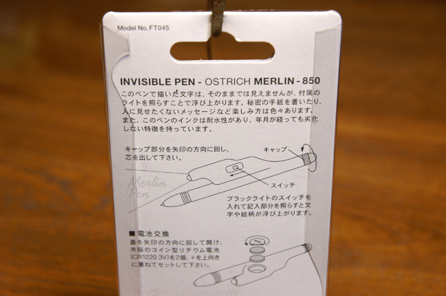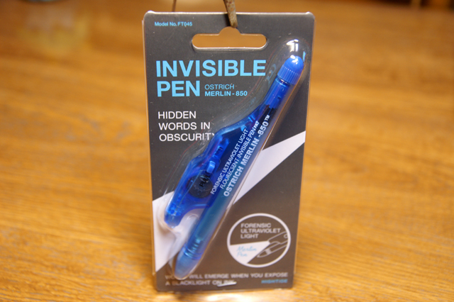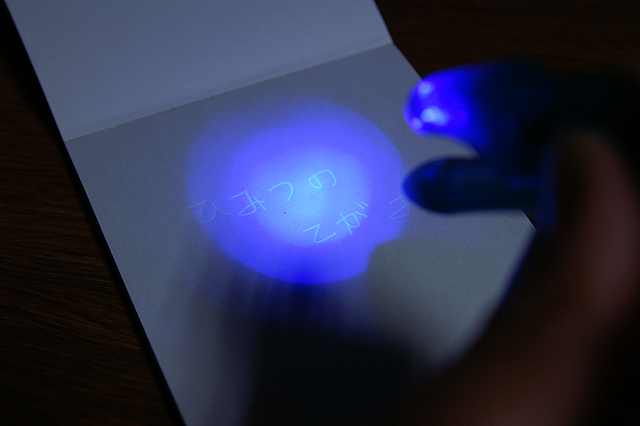 無色の蛍光塗料インキで書いたものを、ブラックライトで輝かせる素敵ペン。