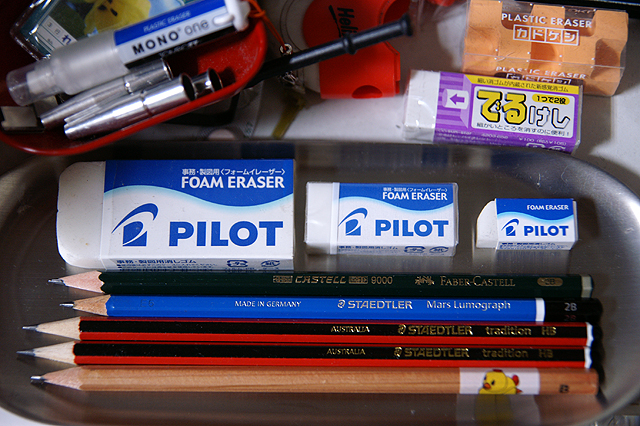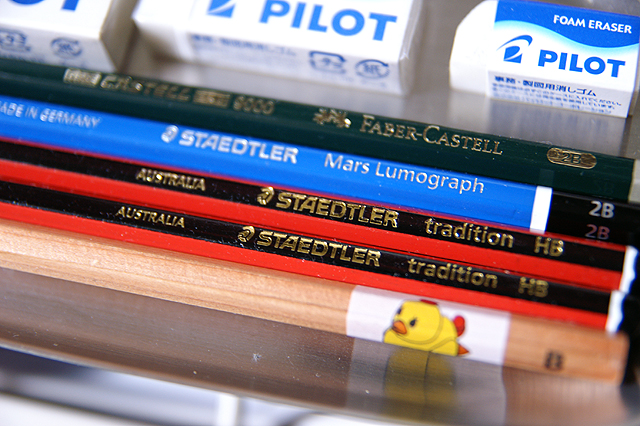 あいかわらず鉛筆三昧 ここんとこ安定していた鉛筆三昧ですが、新しい仲間が加わったのと、消しゴム三昧も始まりそうな予感がぎゅんぎゅんするので反省もこめて写真を撮ってみたり(笑)新顔はステッドラー。それも国内では珍しい(というか見たことがない)traditionシリーズ、AUSTRALIA製(?)です。雑貨屋memeの店主めめちゃんのオーストラリア留学のお土産なのですが。ステッドラーってみんなドイツ製じゃないんですか?現地製造している例があるのでしょうか。手前にあるアヒル隊長もびっくりです! [0回] コメント コメントを書く コメントを書く コメント送信
